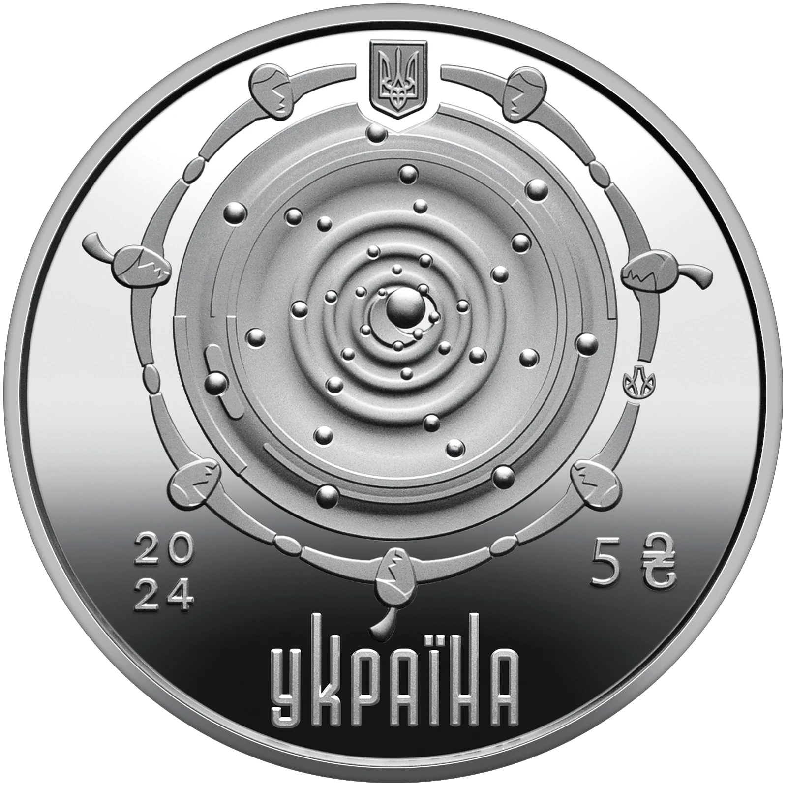 On the obverse of the coin, in the center of the composition, a three-dimensional drop of blood is depicted, surrounded by schematic figures of people joined by handshakes. This image is a testament to the noble common goal of saving lives. Stylized drops of blood move from each figure to the center of the circle, symbolizing the personal contribution of each interested person to the donation. A small State Coat of Arms of Ukraine is placed in the upper center; the inscriptions UKRAINE (below, under the composition), denomination 5 and the graphic symbol of the hryvnia (below right), minting year - 20/24 (below left of the figures), as well as the logo of the Banknote and Mint of the National Bank of Ukraine (right between the figures).