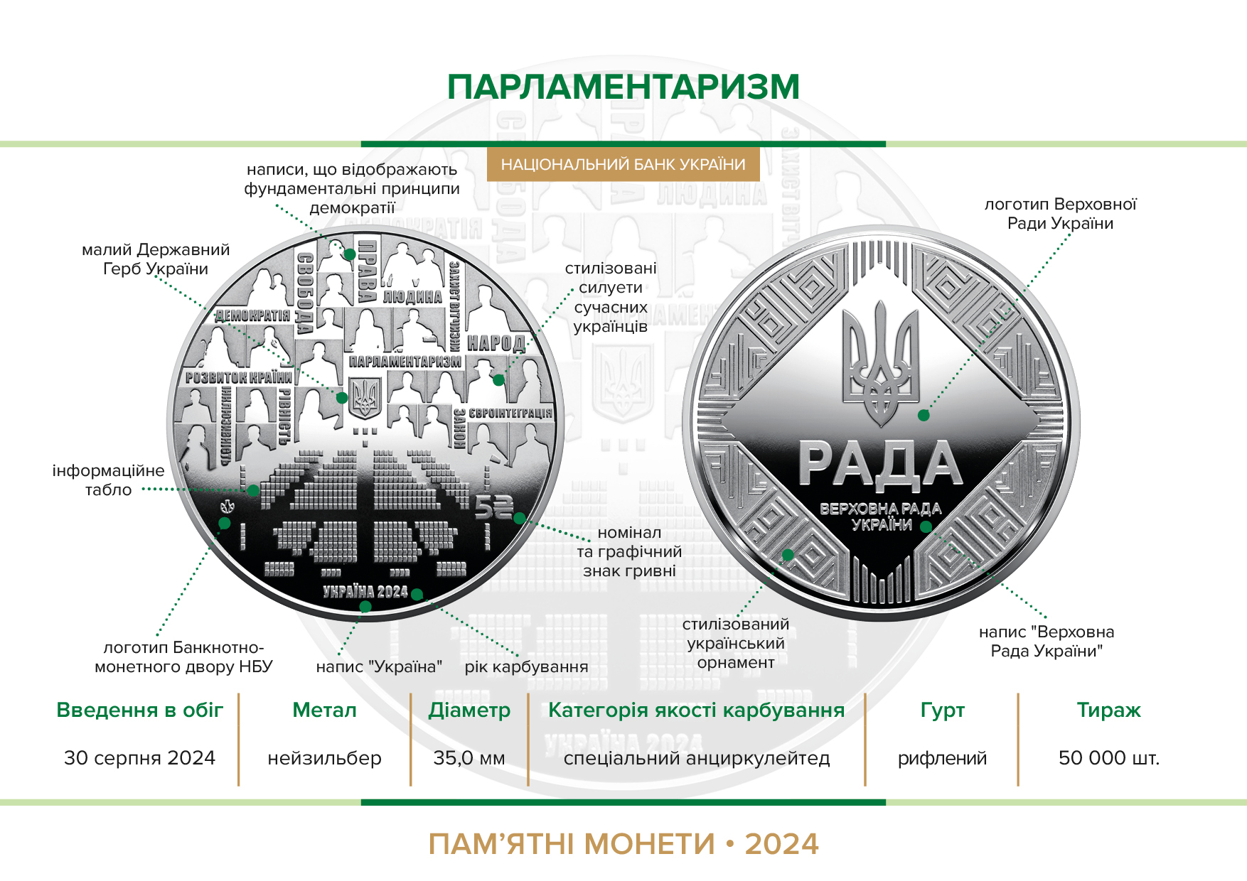 The "Parliamentarism" commemorative coin is dedicated to the system of political organization of the state, an important component of the country's democratic system, which is based on the principles of popular representation, separation of powers and the rule of law. In Ukraine, the only body of legislative power is the Verkhovna Rada. It forms the legislative framework, controls the executive power and determines the strategic directions of the state's development. At the current stage, even under martial law, the Verkhovna Rada is working on improving the legislative framework, protecting the state and citizens, as well as implementing reforms aimed at changing worldview principles at all levels of life and moving the country towards European prosperity.