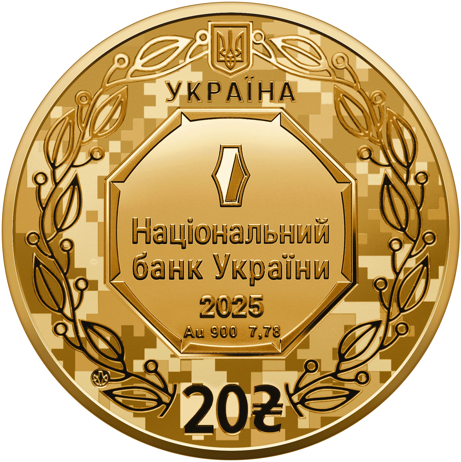 The obverse of the coin features: at the top - a small State Coat of Arms of Ukraine, under which the inscription - UKRAINE; a stylized laurel wreath symbolizing glory and victory is depicted in a circle on the background of the pattern from MM-14 ("The camouflage pattern of the 2014 sample", also known as "pixel" and "Ukrainian pixel"); below – denomination of 20 and graphic sign of hryvnia. In the central part, an octagonal cartouche on a mirror background depicts the logo, under which the inscriptions: NATIONAL / BANK OF UKRAINE / 2025, as well as the designation of the metal, its assay and mass in purity: AU 900 7.78. At the bottom left is the logo of the Banknote and Mint of the National Bank of Ukraine.