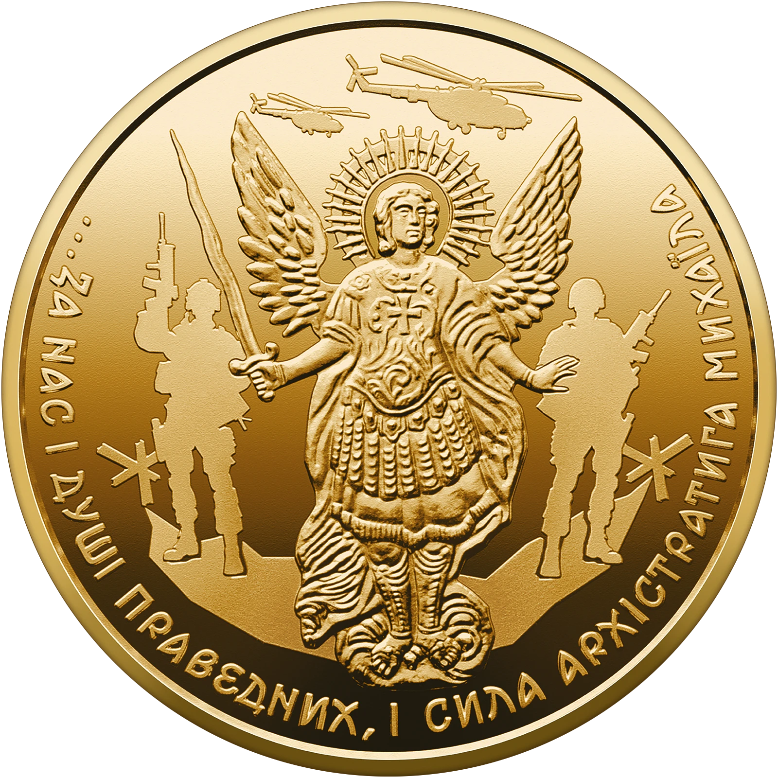 On the reverse of the coin, on a mirror background, Michael the arch-strategist is depicted; on the right and left are stylized silhouettes of soldiers of the Armed Forces of Ukraine, rotorcraft and anti-tank hedgehogs, which compositionally emphasize the struggle for state independence; around the circle is the inscription: ...FOR US AND THE SOULS OF THE RIGHTEOUS AND THE STRENGTH OF ARCHISTRATE MIKHAIL (a line from Taras Shevchenko's poem "Haydamaki"; executed in the font "ChebanykSansN.2017 © VasylChebanyk").
