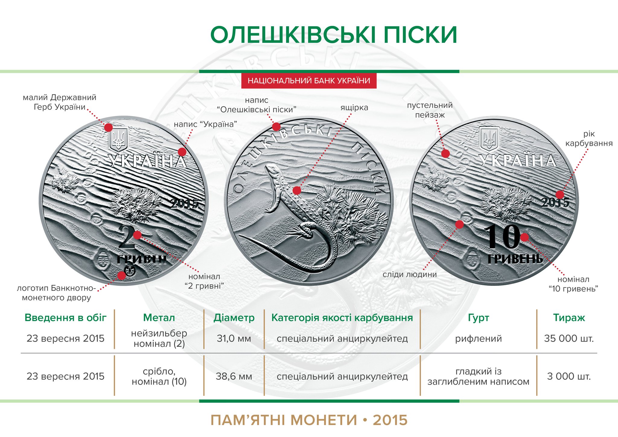 Reverse: against the matte background of a desert landscape there is depicted a lizard; above, there is the semicircular legend: ОЛЕШКІВСЬКІ ПІСКИ (OLESHKY SANDS).