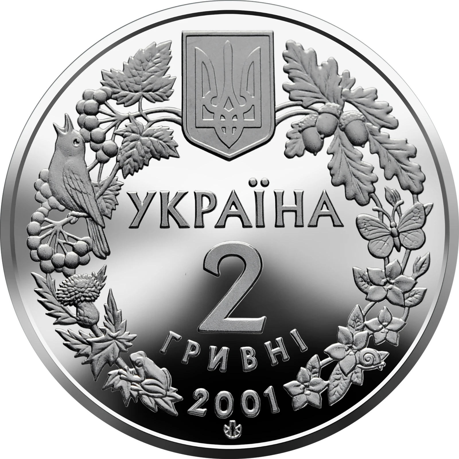 On the coin obverse set in the wreath made of images of plants and animals there is engraved the small National Emblem of Ukraine and a four line legend: УКРАЇНА, 2, ГРИВНІ, 2001 (Ukraine/ 2/ hryvnia/ 2001). On the coin there is also placed the logotype of the NBU Mint.