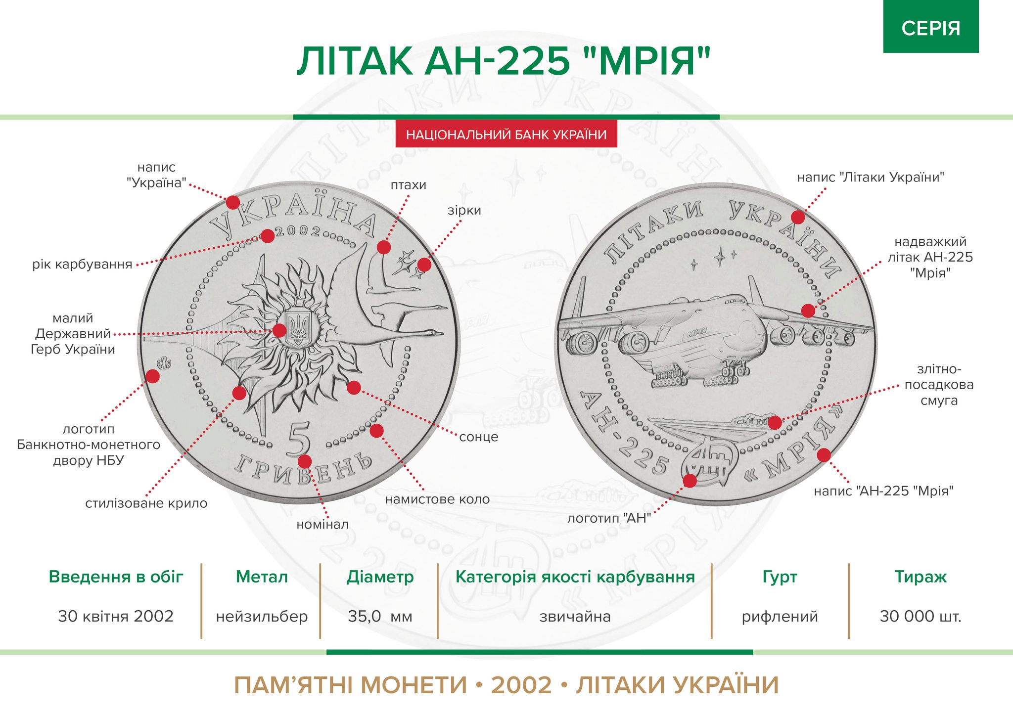 On the coin reverse there is represented a super heavy aircraft over a runway encircled with the inscriptions: ЛІТАКИ УКРАЇНИ (aircrafts of Ukraine) (above) and АН-225 `МРІЯ (AN-225 `Mria`) (beneath); the АН (AN) logotype being between the latter inscription.