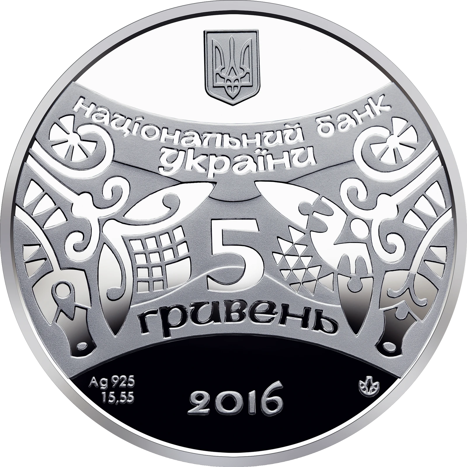 На аверсе монеты размещены: вверху малый Государственный Герб Украины, под которым надпись НАЦІОНАЛЬНИЙ БАНК/УКРАЇНИ; в центре в окружении стилизованного растительного орнамента - номинал 5/ГРИВЕН; внизу год - 2016, а также обозначение металла, его пробы - Ag 925, массы в чистоте - 15,55 и логотип Монетного двора Национального банка Украины.