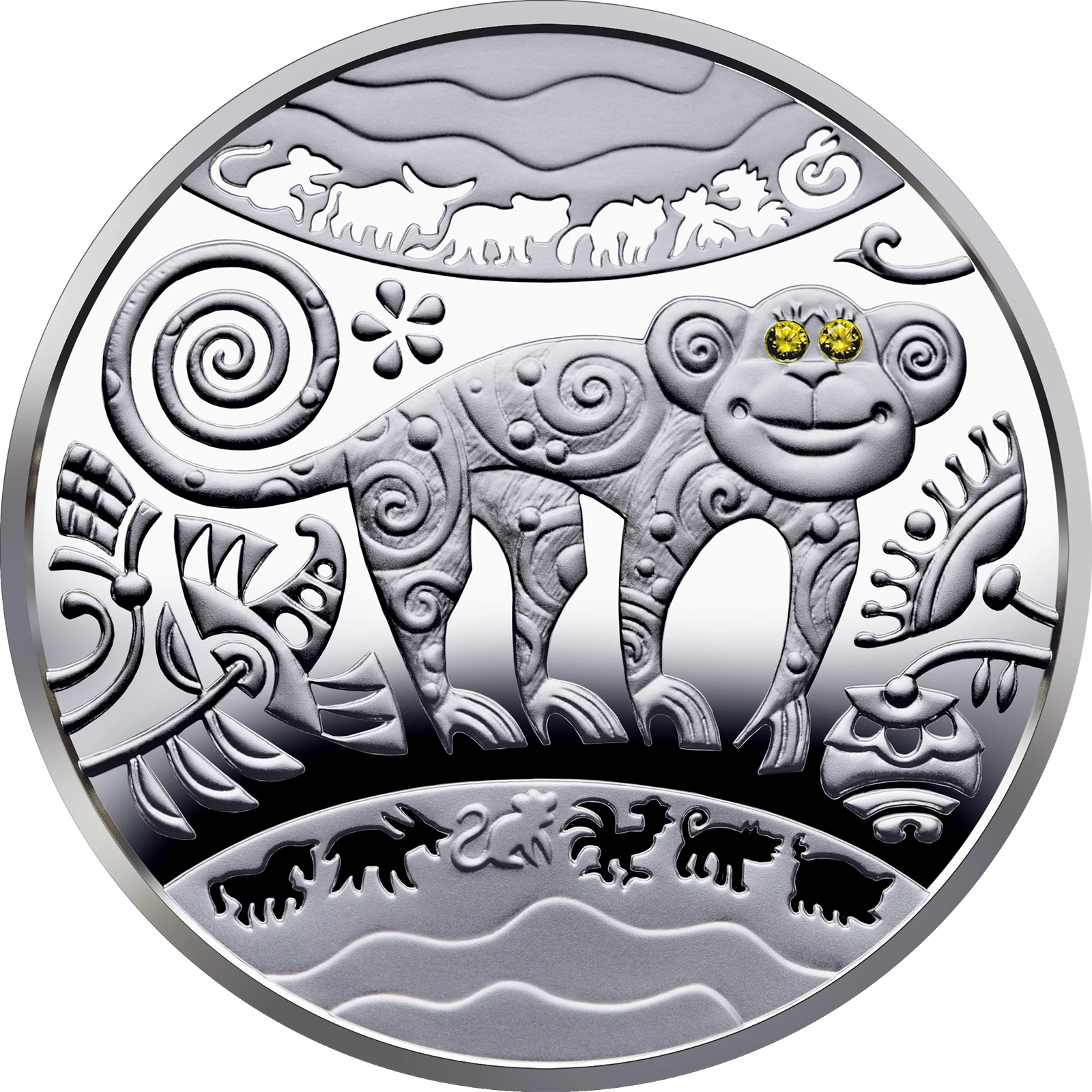 На реверсе монеты в окружении стилизованного растительного орнамента изображена в лубочном стиле обезьяна, глаза которой украшены кубическими оксидами циркония желтого цвета. Над этой композицией и под ней размещены абрисные фигурки всех 12 символов восточного календаря. Элемент отделки - кубический оксид циркония диаметром 1,25 мм.