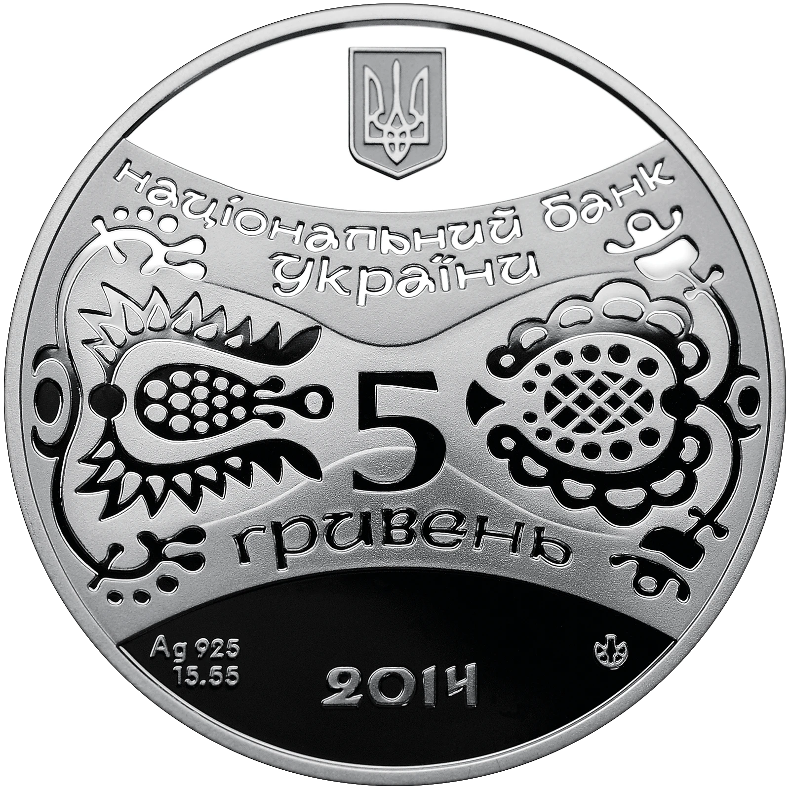 На аверсе монеты размещены: вверху малый Государственный Герб Украины, под которым - надпись НАЦИОНАЛЬНЫЙ БАНК/УКРАИНЫ в окружении стилизованного растительного орнамента - номинал 5/ГРИВЕН; внизу - год чеканки монеты 2014, а также обозначение металла, его пробы - Ag 925, массы в чистоте - 15,55 и логотип Монетного двора Национального банка Украины.