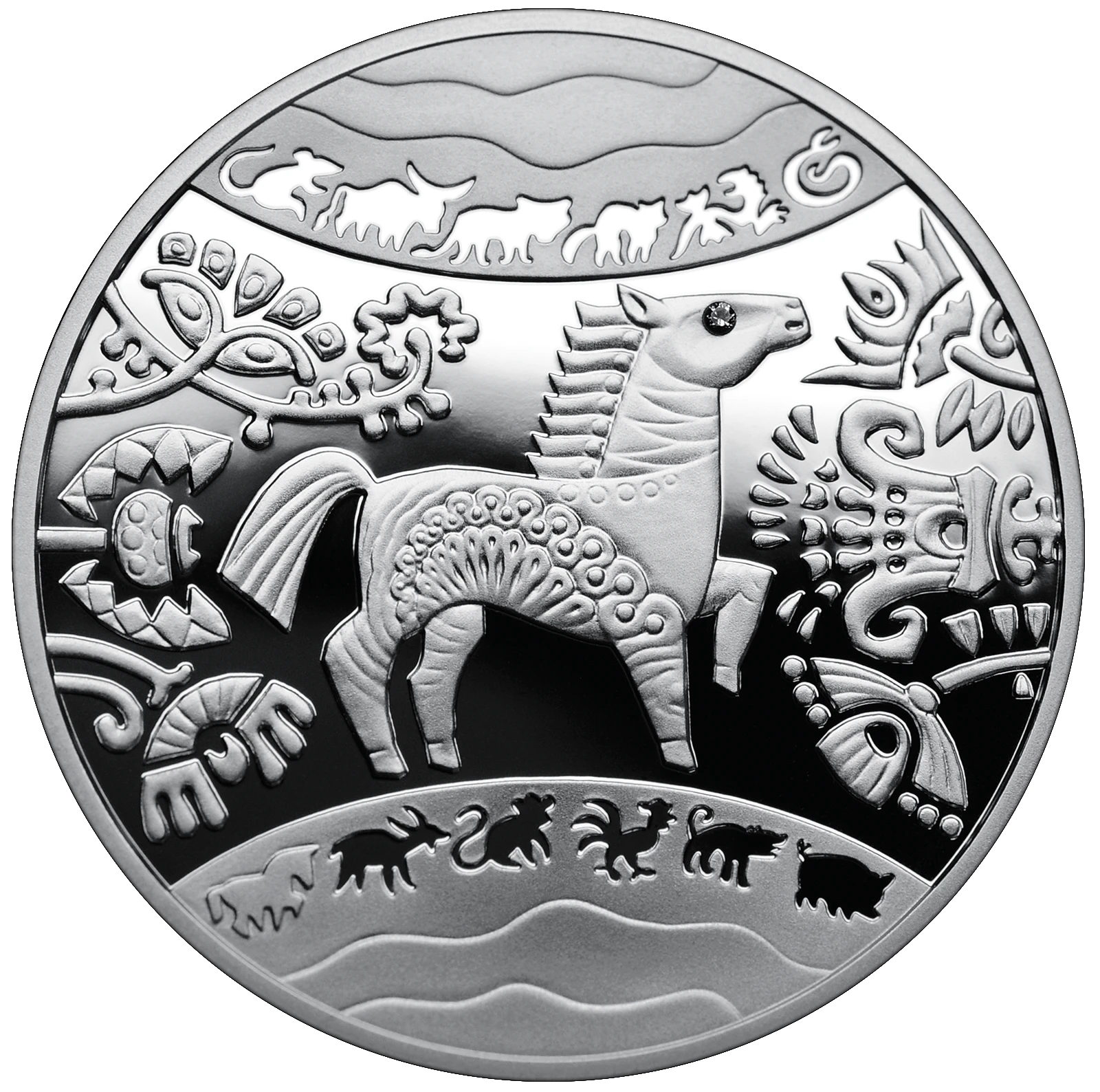 На реверсе монеты в окружении стилизованного растительного орнамента изображен в лубочном стиле лошади, глаз которого украшен кубическим оксидом циркония коричневого цвета. Над этой композицией и под ней размещены абрисные фигурки всех 12 символов восточного календаря. (Элемент отделки - кубический оксид циркония диаметром 1,0 мм.)