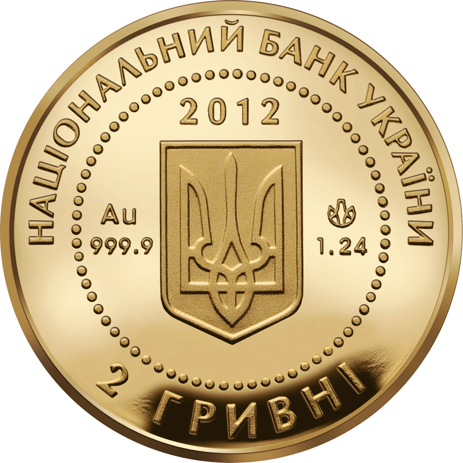 На аверсе монеты в кругу из бусин размещен малый Государственный Герб Украины, над которым - год чеканки монеты - 2012; между бусовым кругом и кантом монеты - круговые надписи: НАЦИОНАЛЬНЫЙ БАНК УКРАИНЫ (вверху), 2 ГРИВНИ (внизу), а также обозначение металла, его пробы - Au 999,9 (слева), массы - 1,24 и логотип Монетного двора Национального банка Украины (справа).