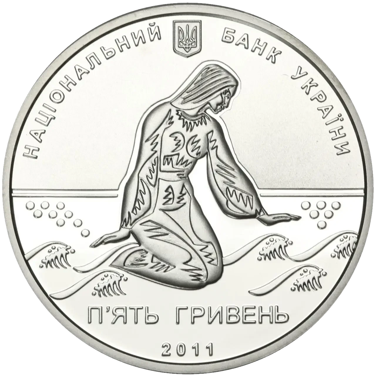 На аверсе монеты размещены: вверху малый Государственный Герб Украины и надпись полукругом НАЦИОНАЛЬНЫЙ БАНК УКРАИНЫ, стилизованная композиция, символизирующая творчество Днепровской Чайки, - девушка у моря, внизу - номинал и год чеканки монеты ПЯТЬ ГРИВЕН/2011.