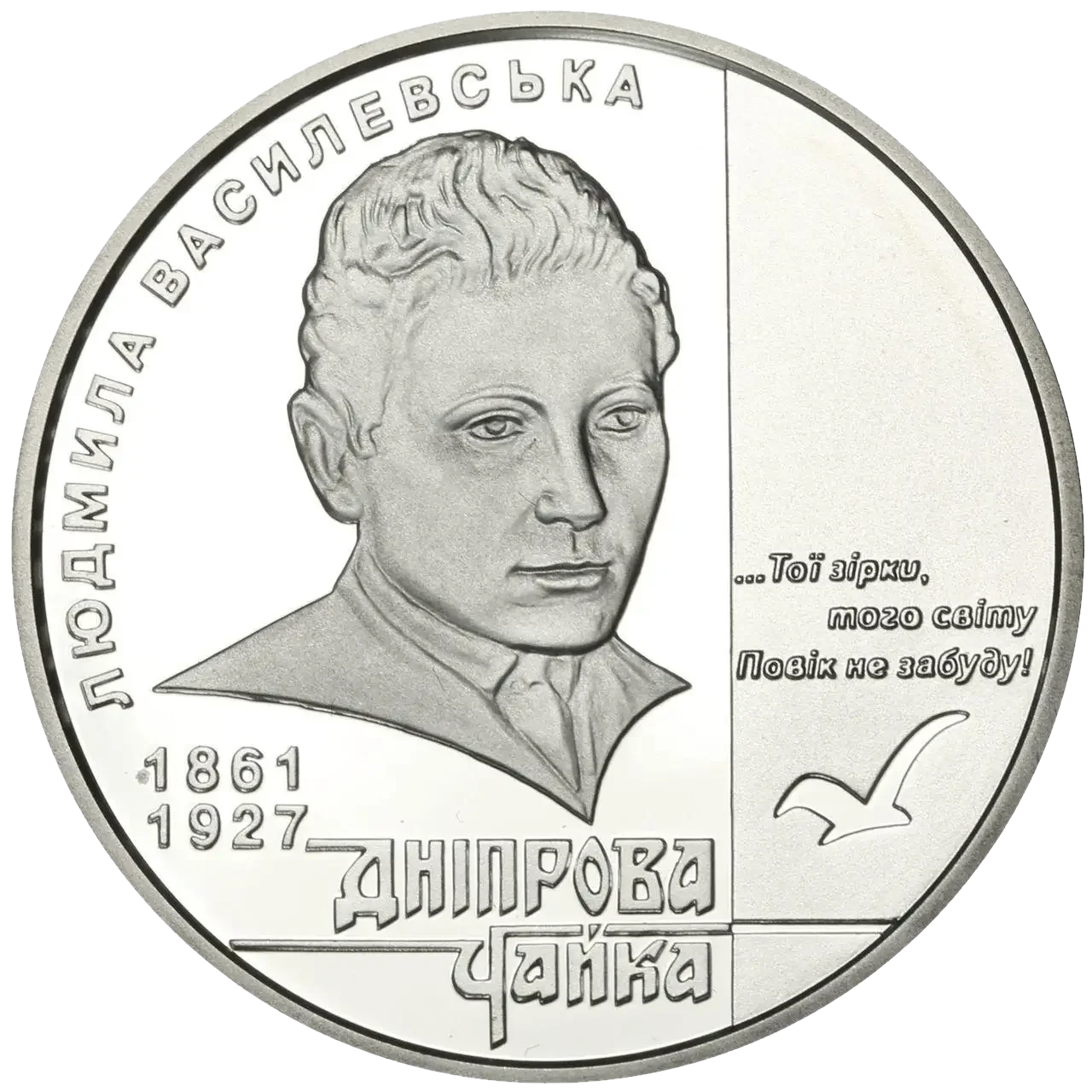 На реверсе монеты на зеркальном фоне изображен портрет писательницы и размещены надписи: ЛЮДМИЛА ВАСИЛЕВСКАЯ (слева полукругом), под портретом - ДНЕПРОВСКАЯ/ЧАЙКА и годы жизни 1861/1927, справа на матовом фоне - строки поэзии Днепровской Чайки `Звезда` - `...Той звезды,/того мира/Век не забуду!`, под которыми - стилизованная чайка.