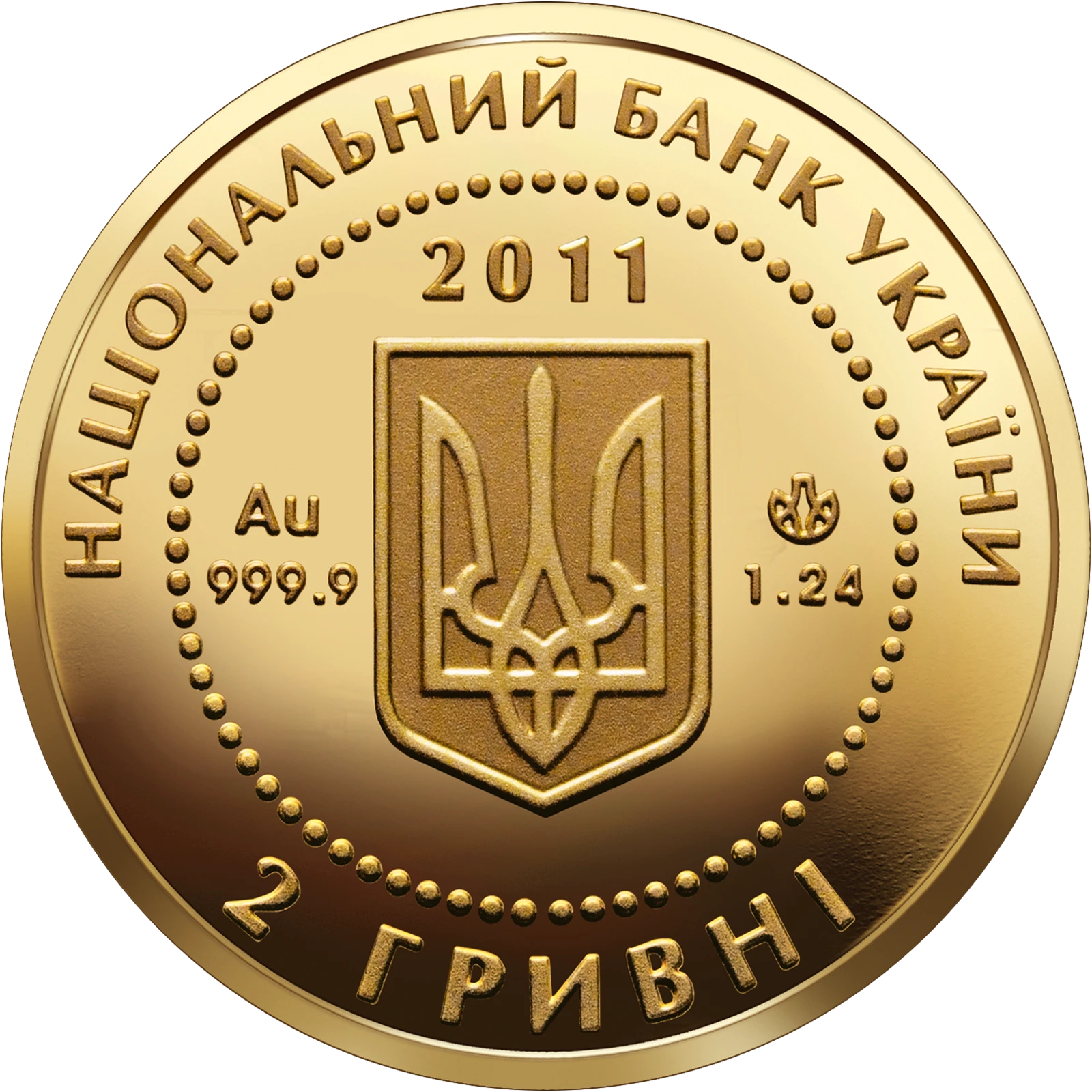 Все объявления о продаже монеты на нашем сайтеНа аверсе монеты в кругу из бусин размещен малый Государственный Герб Украины, над которым - год чеканки монеты - 2011; между бусовым кругом и кантом монеты - круговые надписи: НАЦИОНАЛЬНЫЙ БАНК УКРАИНЫ (вверху), 2 ГРИВНИ (внизу), а также обозначение металла, его пробы - Au 999,9 (слева), масса - 1,24 и логотип Монетного двора Национального банка Украины (справа).