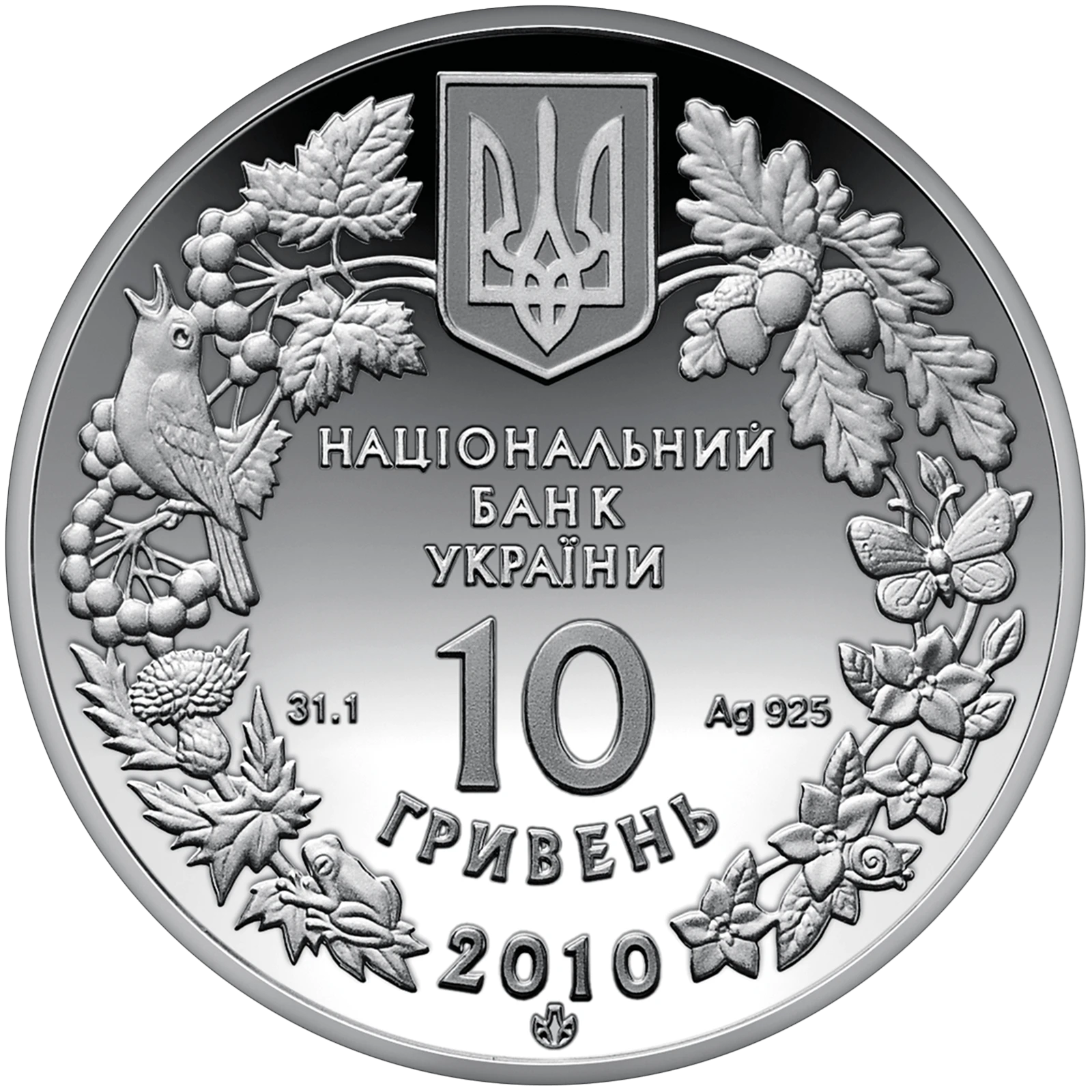 Пока что нет ни одного объявления. Выставить на продажуНа аверсе монеты в обрамлении венка, образованного из изображений отдельных видов флоры и фауны, размещен малый Государственный Герб Украины и надписи: на монете из серебра - НАЦИОНАЛЬНЫЙ/ БАНК/ УКРАИНЫ/ 10/ ГРИВЕНЬ/ 2010, а также обозначение металла и его пробы - Ag 925, масса в чистоте - 31,1, логотип Монетного двора Национального банка Украины.