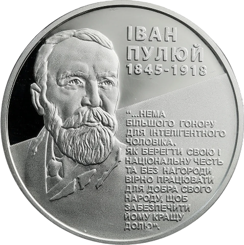 На реверсе монеты изображен портрет Ивана Пулюя, справа от которого размещены надписи: ІВАН/ПУЛЮЙ/ 1845 - 1918 (вверху) и его высказывание: `... НЕТ/ БОЛЬШЕГО ГОНОРА/ ДЛЯ ИНТЕЛЛИГЕНТНОГО МУЖЧИНЫ,/ КАК БЕРЕЧЬ СВОЮ И/ НАЦИОНАЛЬНУЮ ЧЕСТЬ И БЕЗ НАГРАДЫ/ ВЕРНО РАБОТАТЬ ДЛЯ ДОБРА СВОЕГО/ НАРОДА, ЧТОБЫ ОБЕСПЕЧИТЬ ЕМУ ЛУЧШУЮ СУДЬБУ`.
