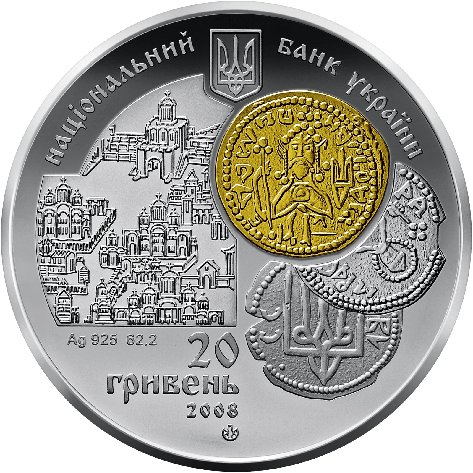 Все объявления о продаже монеты на нашем сайтеНа аверсе монеты размещены: вверху - малый Государственный Герб Украины, надпись полукругом НАЦИОНАЛЬНЫЙ БАНК УКРАИНЫ, композиция из монет - локально позолоченный златник (содержание золота 0,0004 г) и срібляники (справа), фрагмент реконструкции древнего Киева (слева), под которым - обозначение металла, его пробы - Ag 925, масса в чистоте - 62,2, номинал монеты --20/ГРИВЕН, год чеканки монеты - 2008, а также логотип Монетного двора Национального банка Украины.