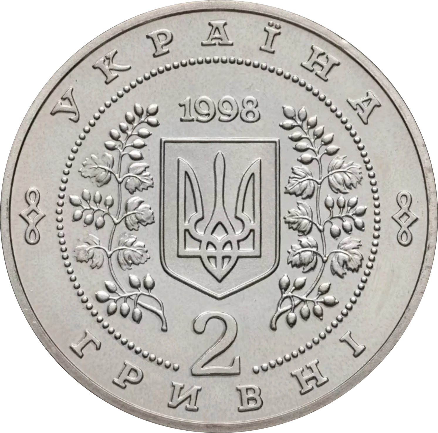 На аверсе монеты в центре бусинкового круга размещено изображение малого Государственного герба Украины в обрамлении ветвей калины. Над гербом размещена дата 1998 - год чеканки монеты. По кругу надписи: вверху УКРАИНА, внизу в две строки 2 ГРИВНИ. Надписи отделены друг от друга орнаментом.