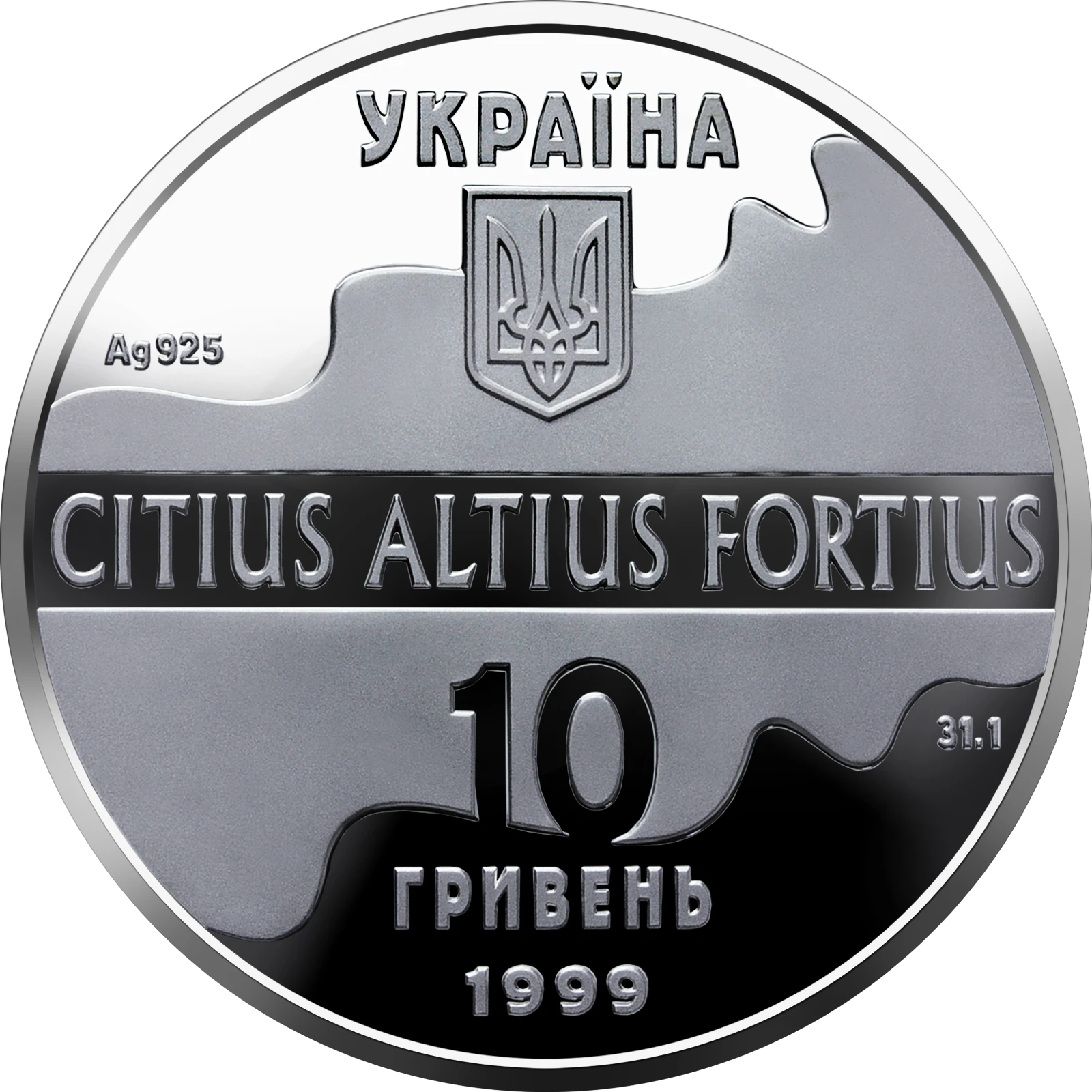 Пока что нет ни одного объявления. Выставить на продажуНа аверсе монеты номиналом 10 гривен на фоне развернутого полотнища размещен малый Государственный герб Украины и прямые надписи в пять строк: УКРАИНА, CITIUS ALTIUS FORTIUS, 10 ГРИВЕН. 1999, обозначение и проба металла - Ag 925 и его вес в чистоте - 31,1.