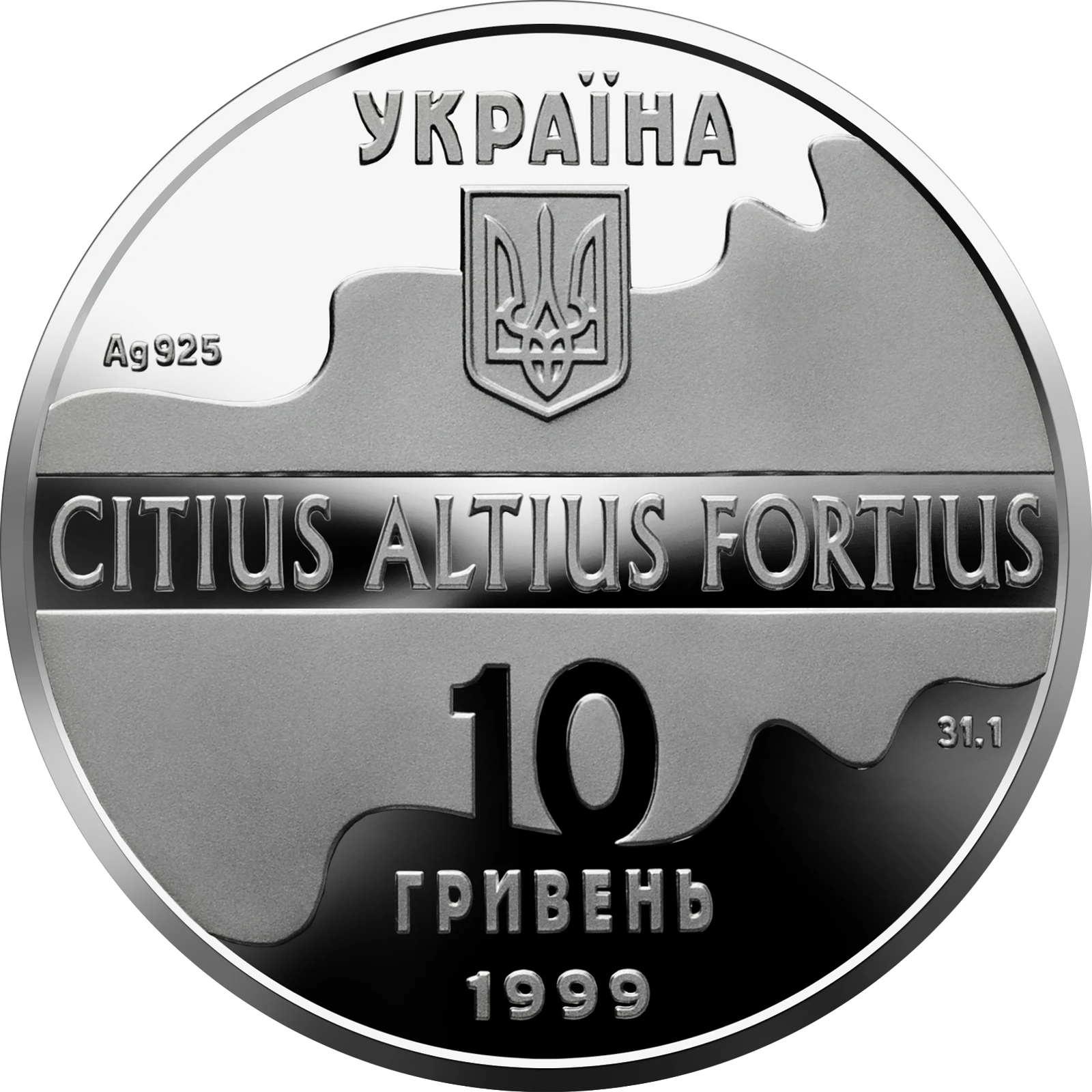 На аверсе монеты номиналом 10 гривен на фоне развернутого полотнища размещен малый Государственный герб Украины и прямые надписи в пять строк: УКРАИНА, CITIUS ALTIUS FORTIUS, 10 ГРИВЕН. 1999, обозначение и проба металла - Ag 925 и его вес в чистоте - 31,1