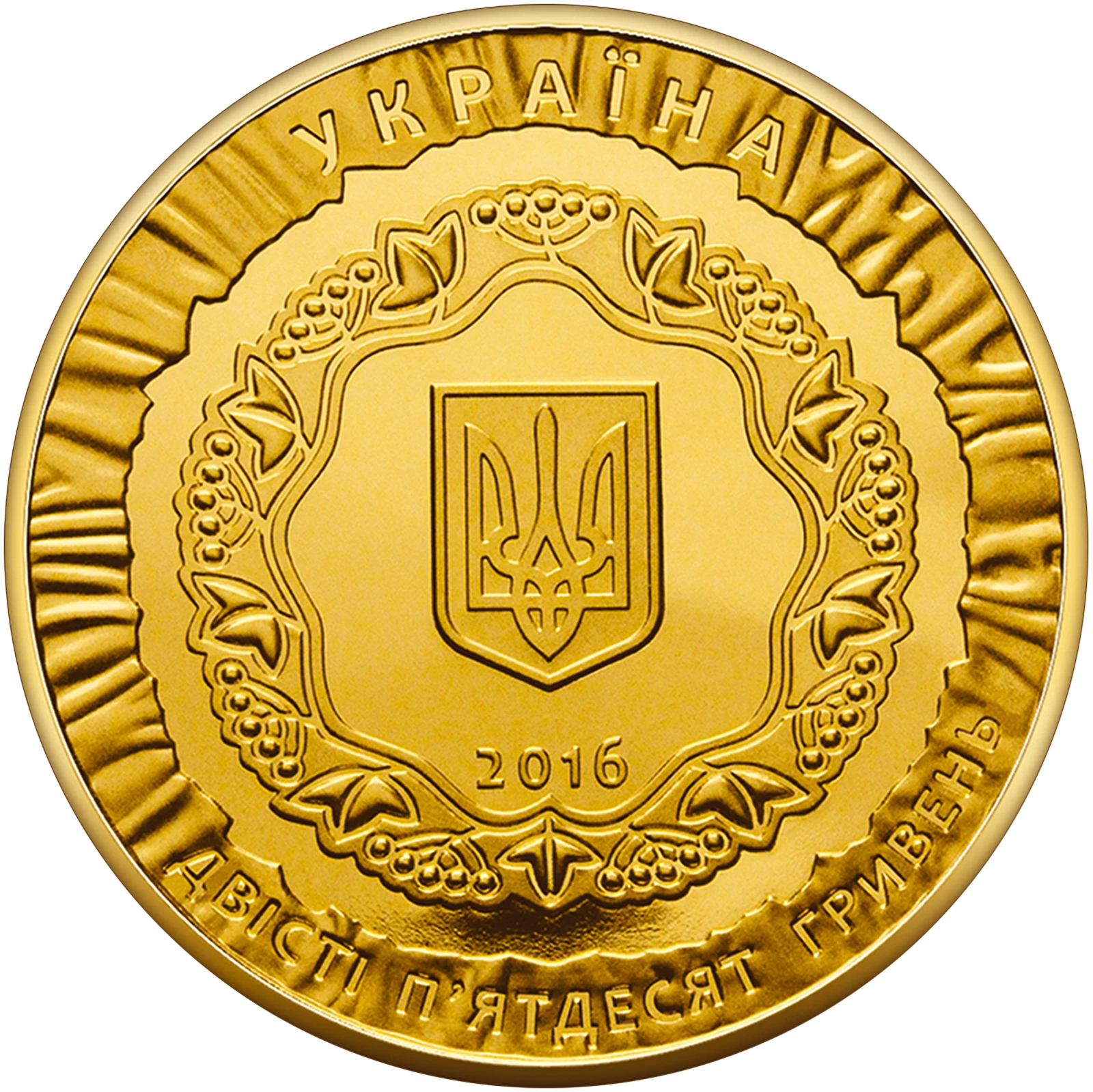 Пока что нет ни одного объявления. Выставить на продажуНа аверсе монеты размещены: на матовом фоне надпись полукругом УКРАИНА (вверху), номинал ДВЕСТИ ПЯТЬДЕСЯТ ГРИВЕН (внизу); в центре на зеркальном фоне, в круге со стилизованного растительного орнамента - малый Государственный Герб Украины, под которым - год чеканки монеты 2016.