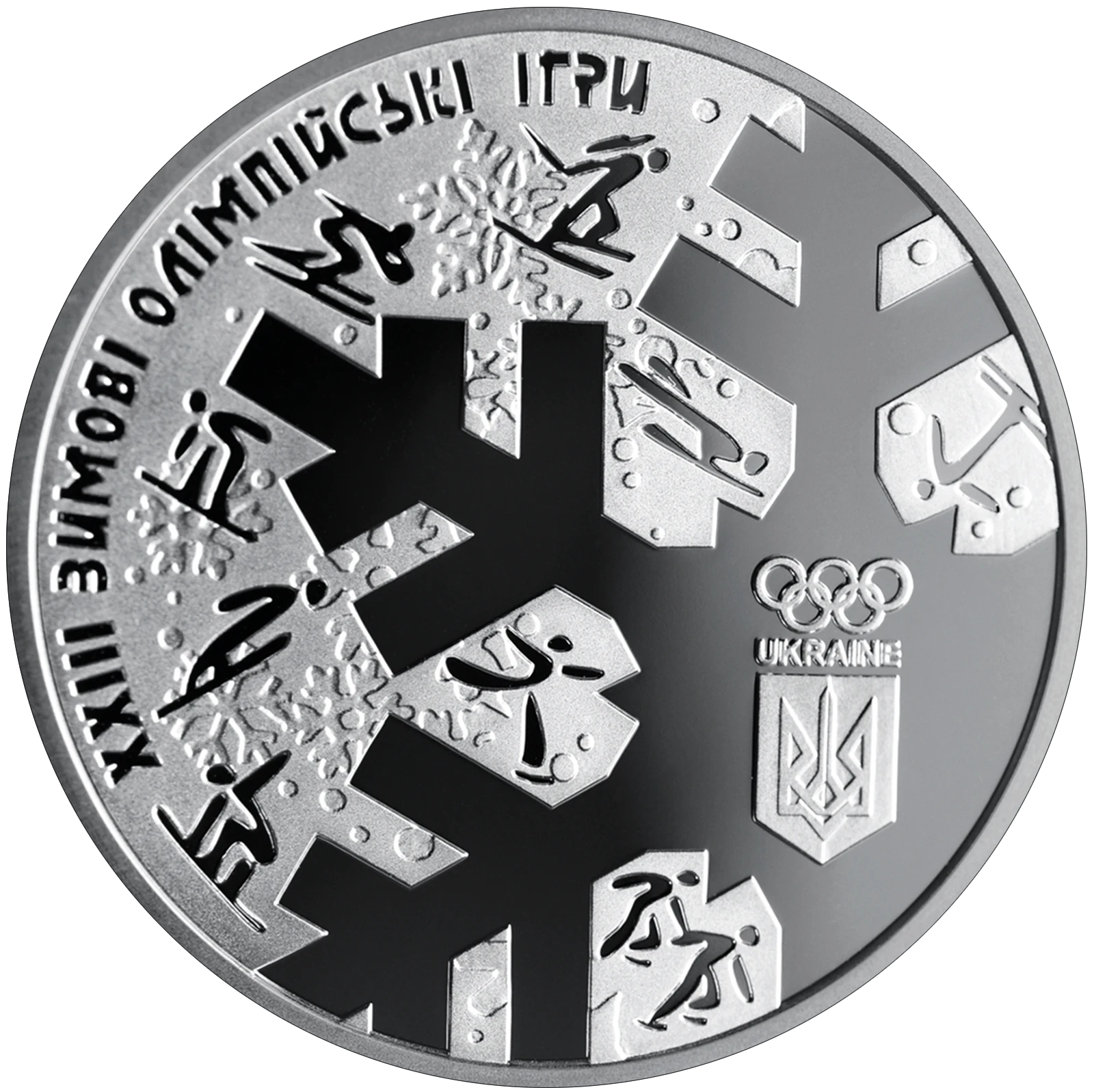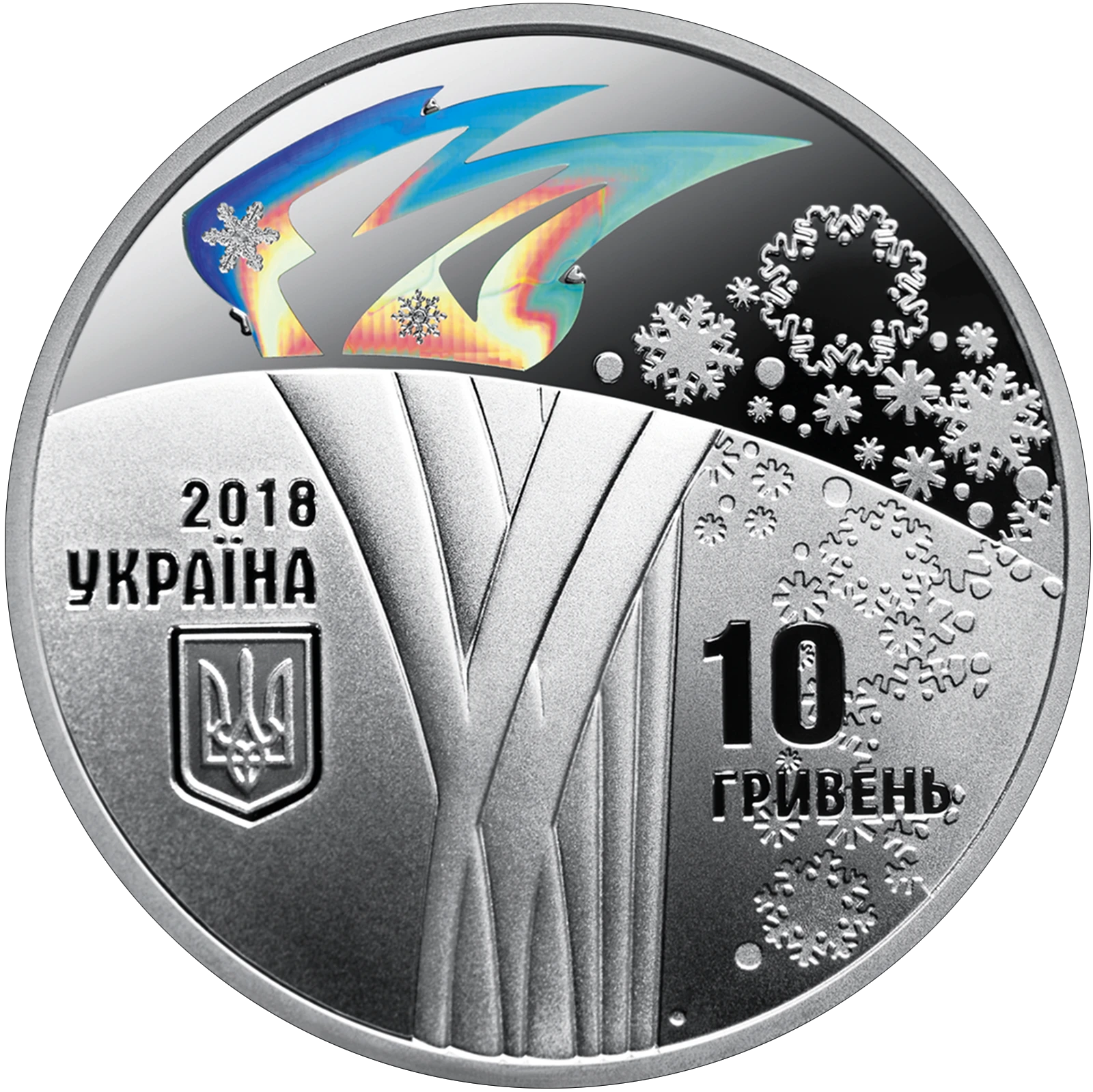 Все объявления о продаже монеты на нашем сайтеНа аверсе монеты размещен стилизованный факел в виде римской цифры XXIII с цветным огнем - одним из символов Олимпийских игр (элемент отделки - голографическое изображение); слева - малый Государственный Герб Украины, над которым надпись УКРАИНА и год чеканки монеты - 2018; справа на фоне стилизованных снежинок отображен номинал - 10/ГРИВЕН.