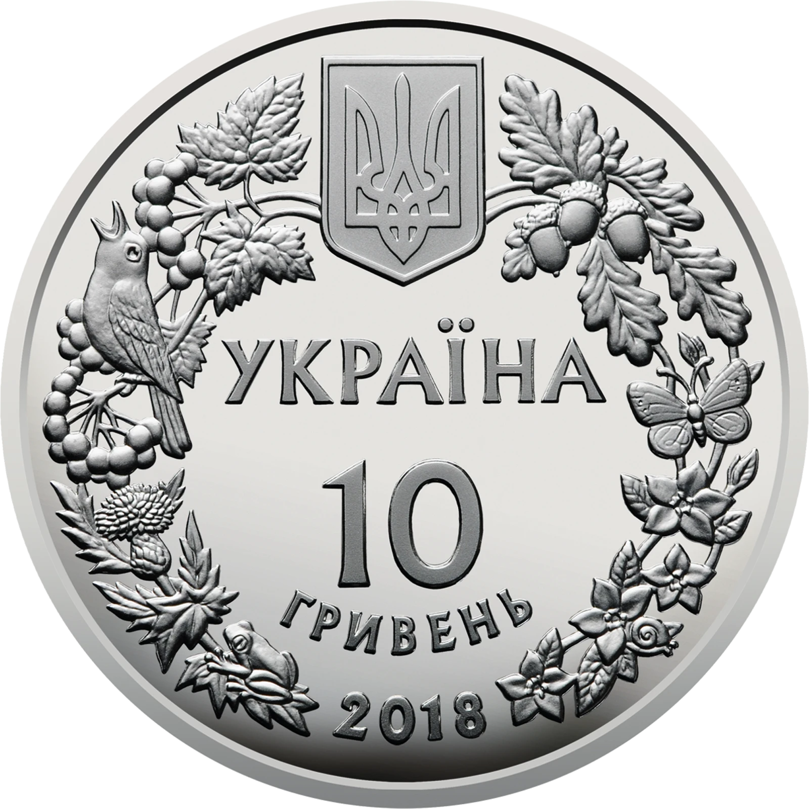 Все объявления о продаже монеты на нашем сайтеНа аверсе монеты в обрамлении венка, образованного из изображений отдельных видов флоры и фауны, размещен малый Государственный Герб Украины и надписи: УКРАИНА/10/ГРИВЕН/2018.