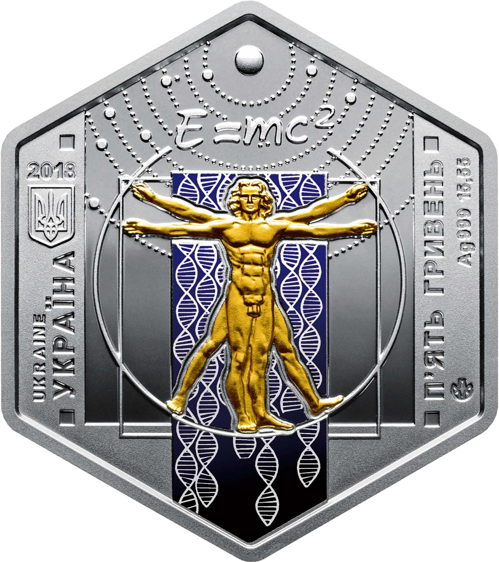 Все объявления о продаже монеты на нашем сайтеНа аверсе монеты размещено: слева-год чеканки монеты 2018, малый Государственный Герб Украины и надписи UKRAINE/УКРАИНА (вертикально); справа - номинал монеты-ПЯТЬ ГРИВЕН, обозначения металла и массы монеты в чистоте - Ag 999 15,55 (вертикально); на фоне стилизованного изображения гелиоцентрической системы мира как символа развития астрономии и философии - уравнение Эйнштейна E=mc (связь между энергией и массой любого вещества), что символизирует теорию относительности, под которой на фиолетовом фоне, заполненном изображением двойной спирали - символа генома человека (использовано тампопечать), - Витрувианский человек с рисунка Леонардо да Винчи, что символизирует `канонические пропорции` (локальная позолота). Внизу справа размещен логотип Банкнотно-монетного двора Национального банка Украины.