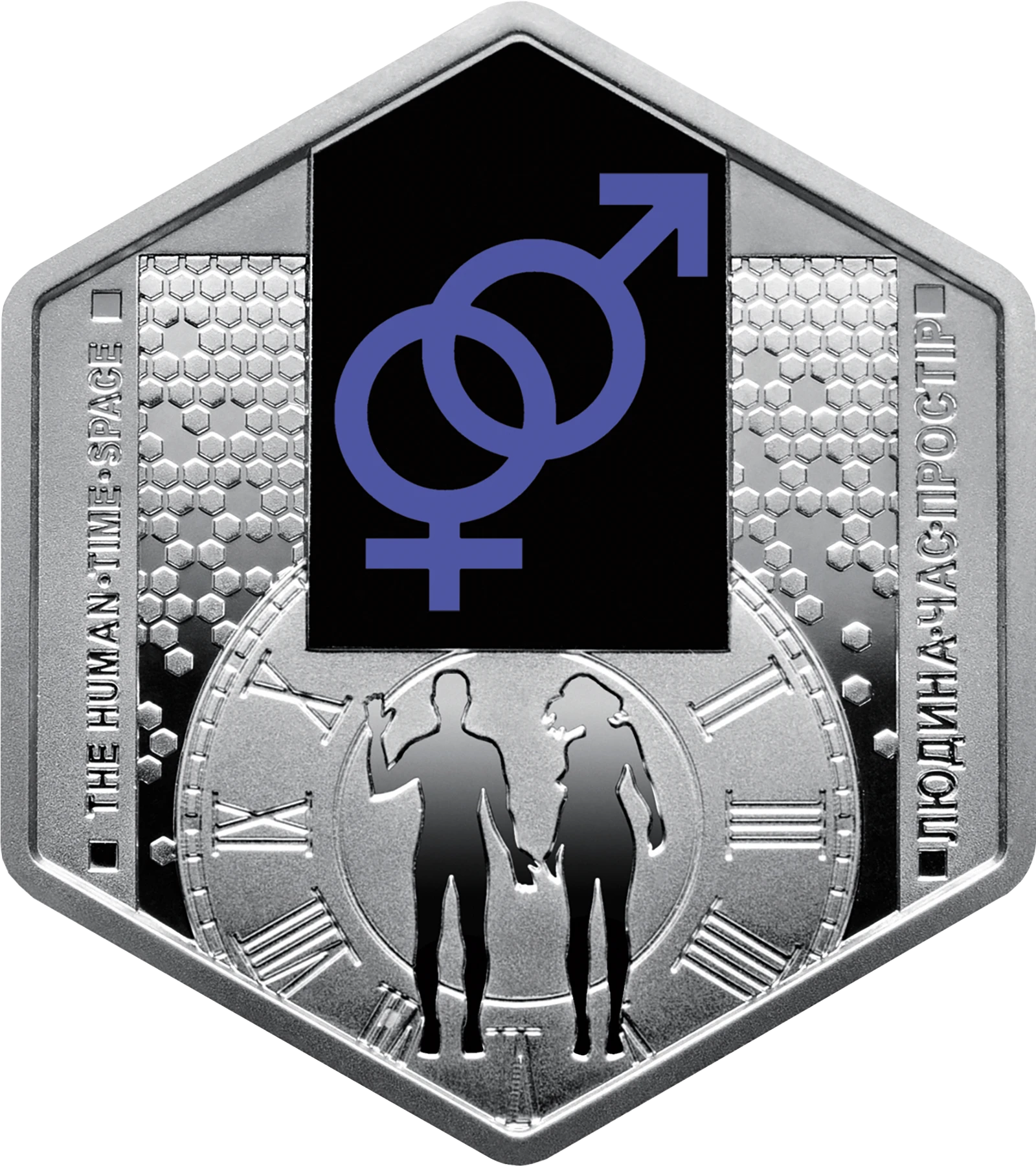 На реверсе монеты размещены: на фоне стилизованной схемы нуклеиновых кислот - часы как символ вечности, времени и его быстротечности, в центре которого - зеркальные силуэты мужчины и женщины, над которыми на черном фоне изображены переплетенные цветные символы женского и мужского пола (использовано тампопечать); вертикальные надписи: THE HUMAN o TIME o SPACE (слева) и ЧЕЛОВЕК o ВРЕМЯ o ПРОСТРАНСТВО (справа).