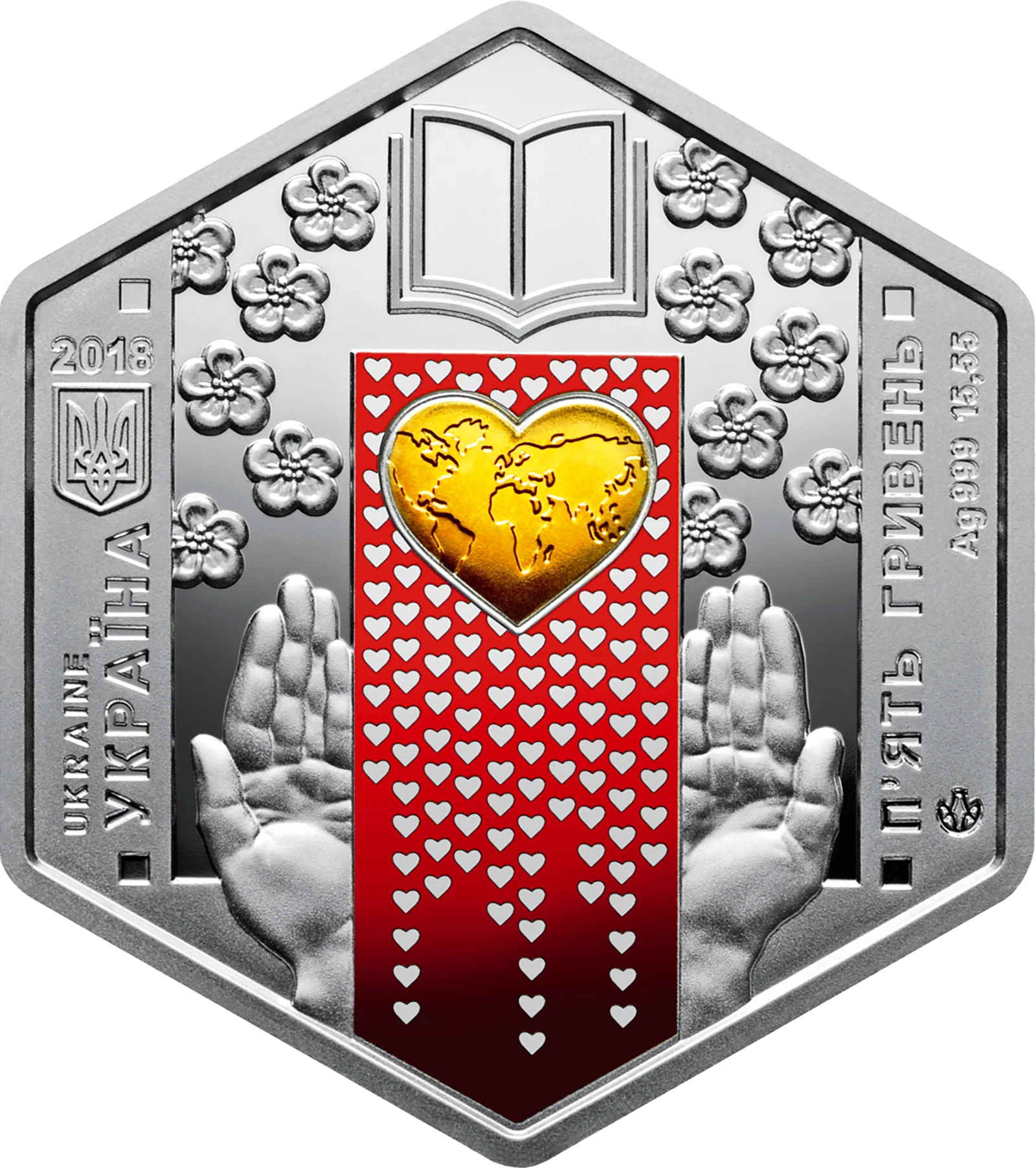 Пока что нет ни одного объявления. Выставить на продажуНа аверсе монеты размещено: слева - год чеканки монеты 2018, малый Государственный Герб Украины и надписи UKRAINE/УКРАИНА (вертикально); справа - номинал монеты-ПЯТЬ ГРИВЕН, обозначения металла и массы монеты в чистоте - Ag 999 15,55 (вертикально); вверху на зеркальном фоне в окружении цветов - книгу как символ познания, под которой - композиция, символизирующая единение человека и планеты Земля: на красном фоне, заполненном серебристыми сердцами (использовано тампопечать), изображено позолоченное сердце (локальная позолота) с очертаниями материков. Композицию поддерживают руки, что символизирует защиту и сохранение жизни. Внизу справа размещен логотип Банкнотно-монетного двора Национального банка Украины.