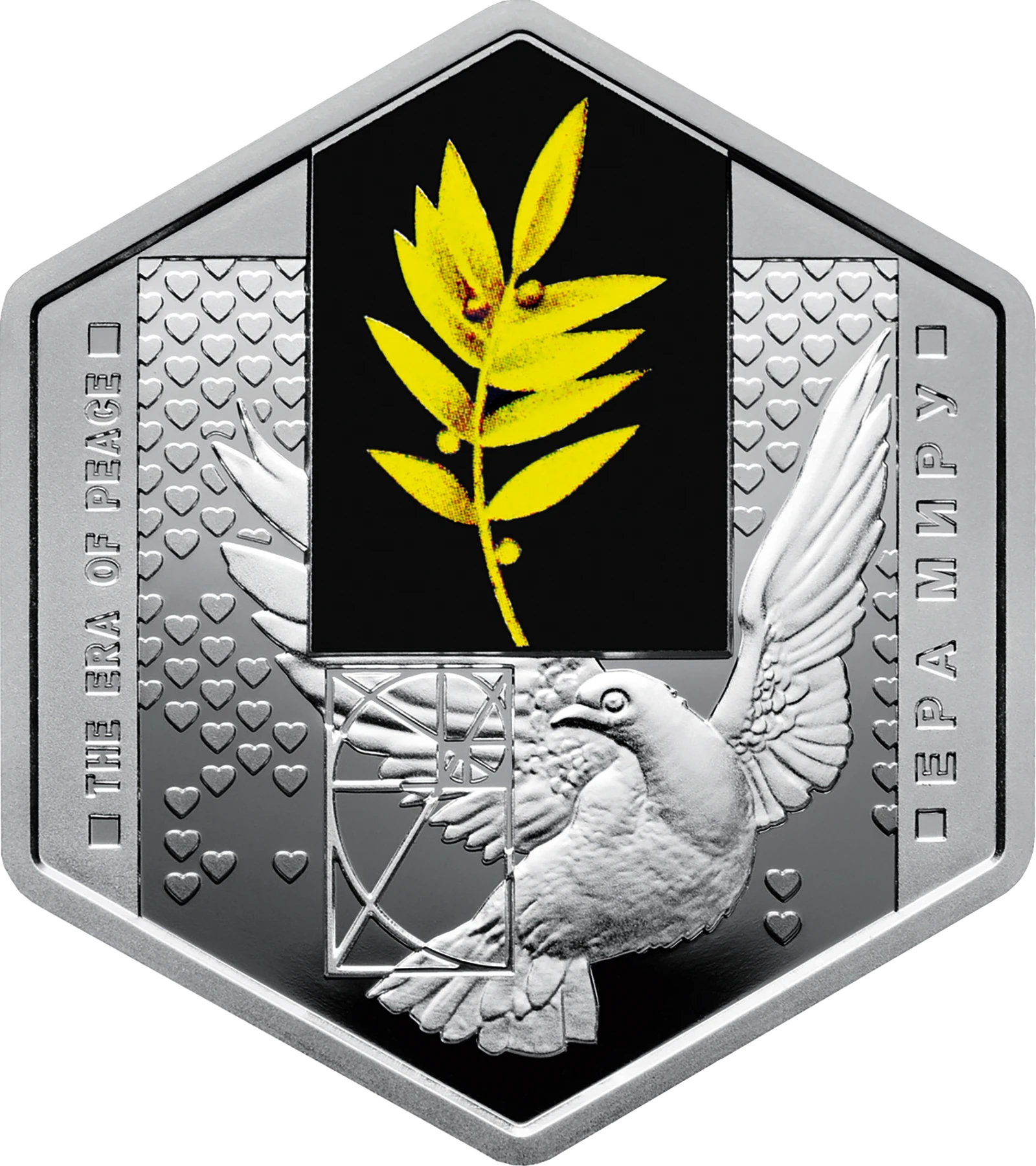 На реверсе монеты размещены: на фоне сердец - композицию: на черном фоне изображен цветной оливковую веточку (использовано тампопечать), которую держит голубь - символ мира и спокойствия, слева от голубя - графическое изображение `золотого сечения`, мыслители эпохи Возрождения назвали воплощением `Божественной сущности`; вертикальные надписи: THE ERA OF PEACE (слева) и ЭРА МИРА (справа).
