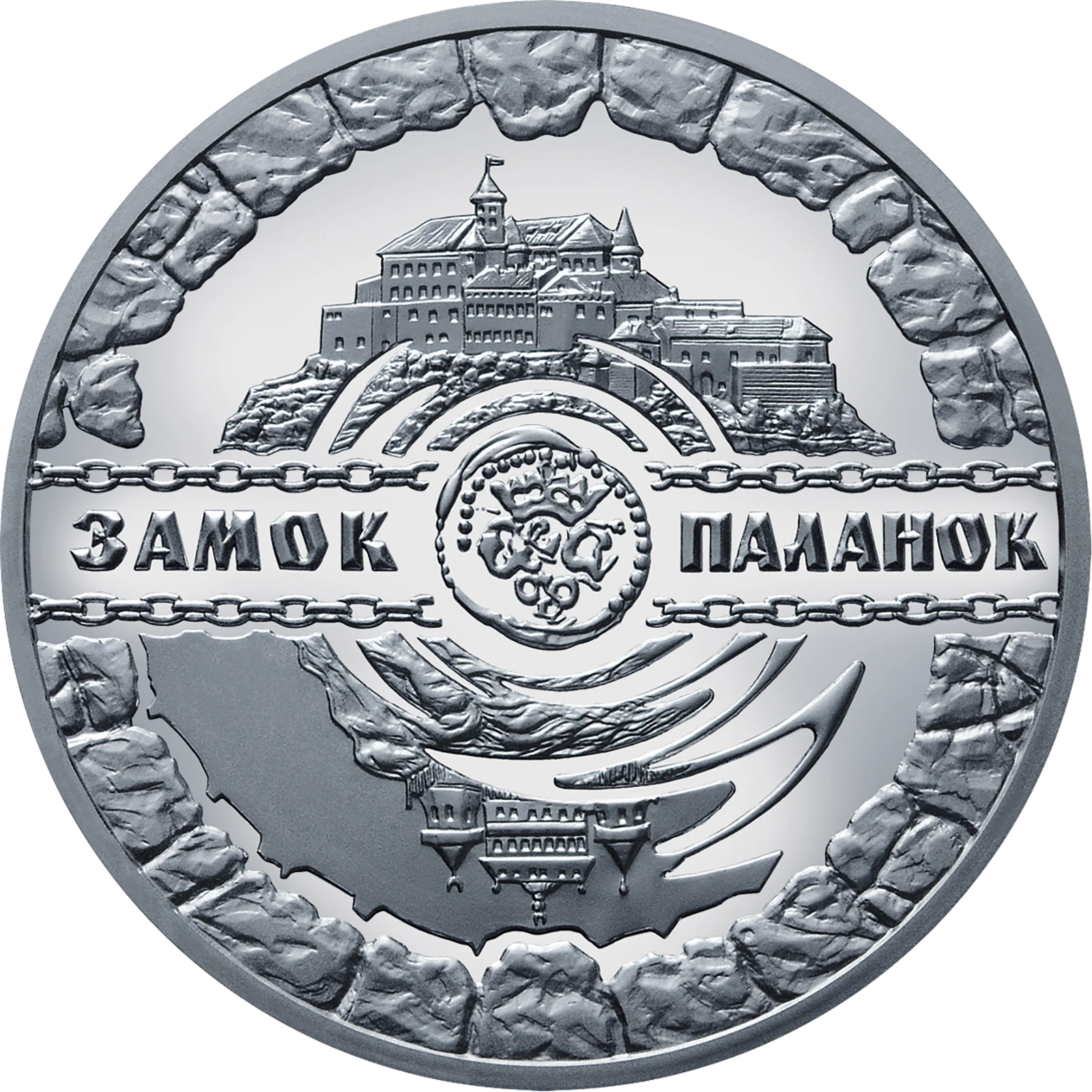 На реверсе монеты размещены: вверху Замок Паланок, внизу – стилизованное отражение в воде старого замка (изображения со старинных гравюр), в центре – стилизованное изображение колодца, в который бросили древнюю монету, от которой расходятся круги воды; слева и справа надписи: ЗАМОК ПАЛАНОК; по кругу – каменная кладка, разделенная цепями.