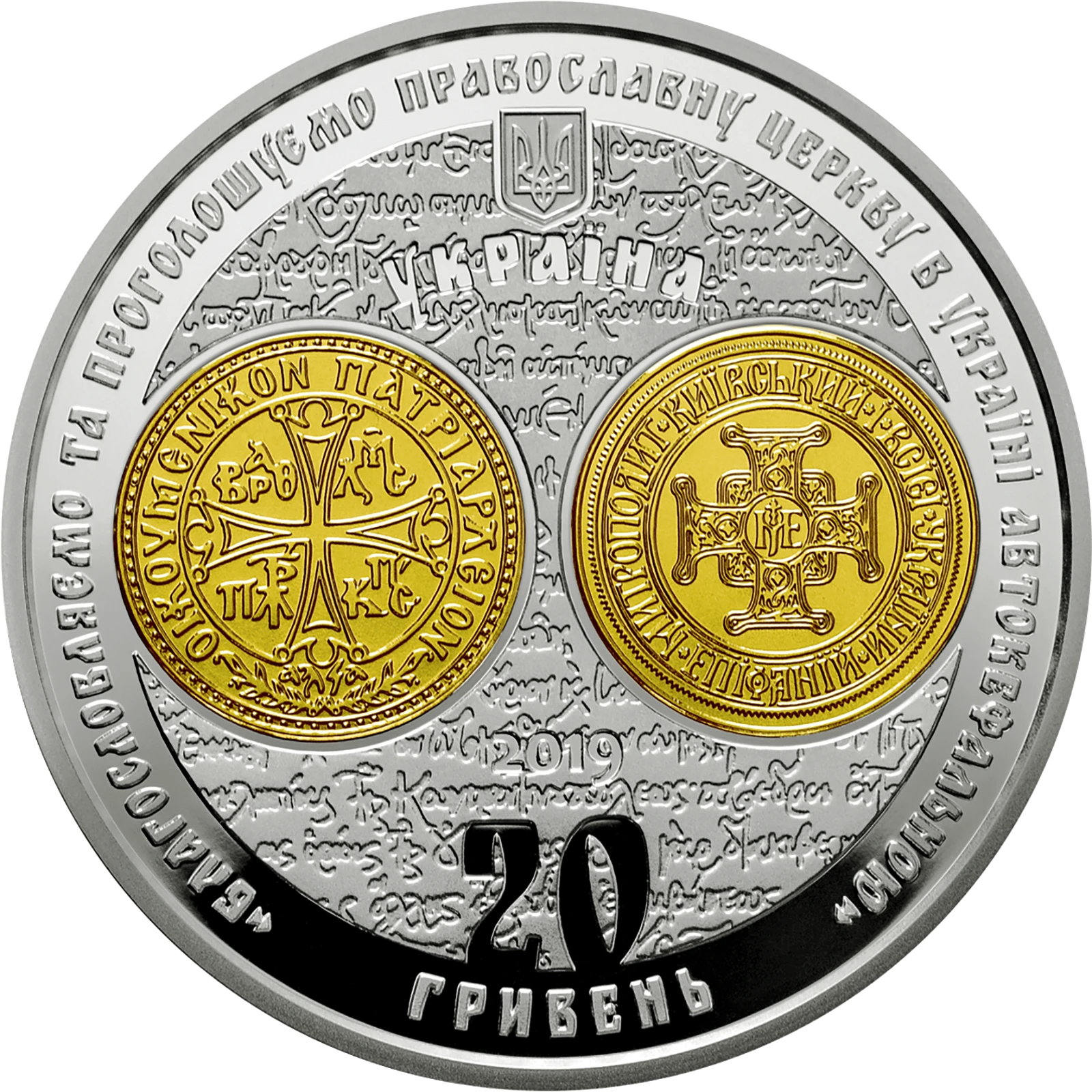 Все объявления о продаже монеты на нашем сайтеНа аверсе монеты размещены: вверху – малый Государственный Герб Украины, под которым надпись УКРАИНА; на фоне стилизованного рукописного фрагмента Томоса – позолоченные (локальная позолота) оттиски печатей Вселенского Патриарха Варфоломея (слева) и Митрополита Киевского и всея Украины Епифания (справа), под которым – год чеканки монеты 2019 и номинал 20/ГРИВЕН; по кругу надпись: «БЛАГОСЛОВЛЯЕМ И ПРОВОЗГЛАШАЕМ ПРАВОСЛАВНУЮ ЦЕРКОВЬ В УКРАИНЕ АВТОКЕФАЛЬНОЙ».