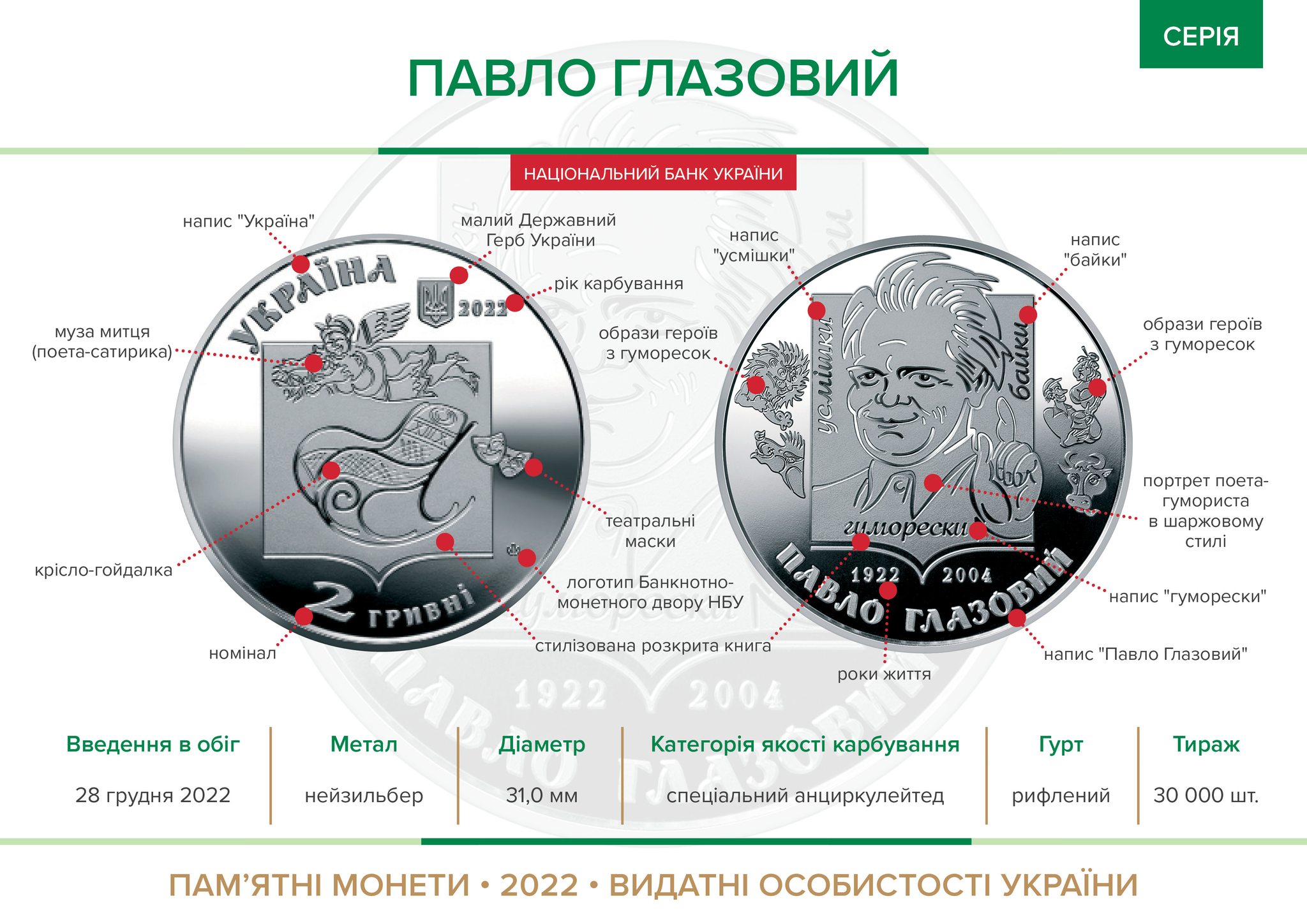 Памятная монета посвящена одному из самых популярных украинских поэтов-юмористов, заслуженному деятелю искусств Украины, лауреату премии имени Остапа Вишни (1988 год), первому лауреату премии имени Петра Сагайдачного (1996 год) – Павлу Прокоповичу Глазовому. Неисчерпаемыми источниками творчества юмориста являются сокровища живого языка, искрящиеся жемчужины народной мудрости. Юмор поэта-сатирика – дружелюбный, веселый; басням присущи остроумие и меткость; многие произведения имеют черты народного анекдота и придают хорошее настроение. Присущие писателю любовь к родной земле, своему народу, болезни за украинский язык, украинское искусство, донесенные до людей в юмористической форме, ободряют в самые сложные минуты жизни, а творчество – открытая страница веселого нрава украинского народа.