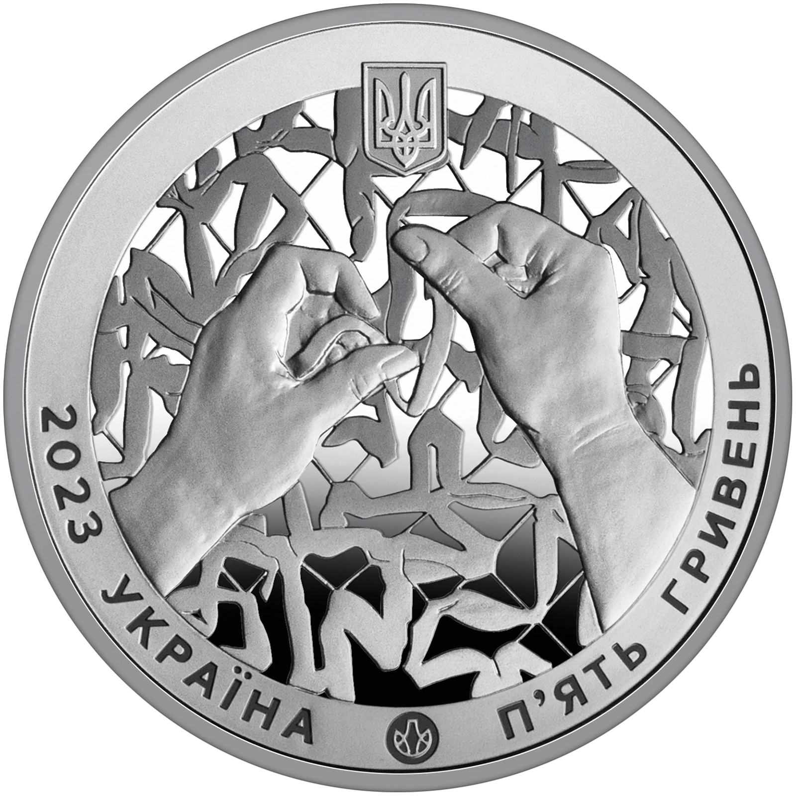 Все объявления о продаже монеты на нашем сайтеНа аверсе монеты размещено: в центре на зеркальном фоне – стилизованное изображение рук во время плетения маскировочной сетки, что символически раскрывает волонтерство как одну из многих форм помощи, всесторонней поддержки и воплощение силы и единства нации во времена сверхтяжелых испытаний; наверху – малый Государственный Герб Украины; надписи полукругом: год чеканки монеты 2023, УКРАИНА (внизу слева), ПЯТЬ ГРИВЕН (внизу справа); логотип Банкнотно-монетного двора Национального банка.