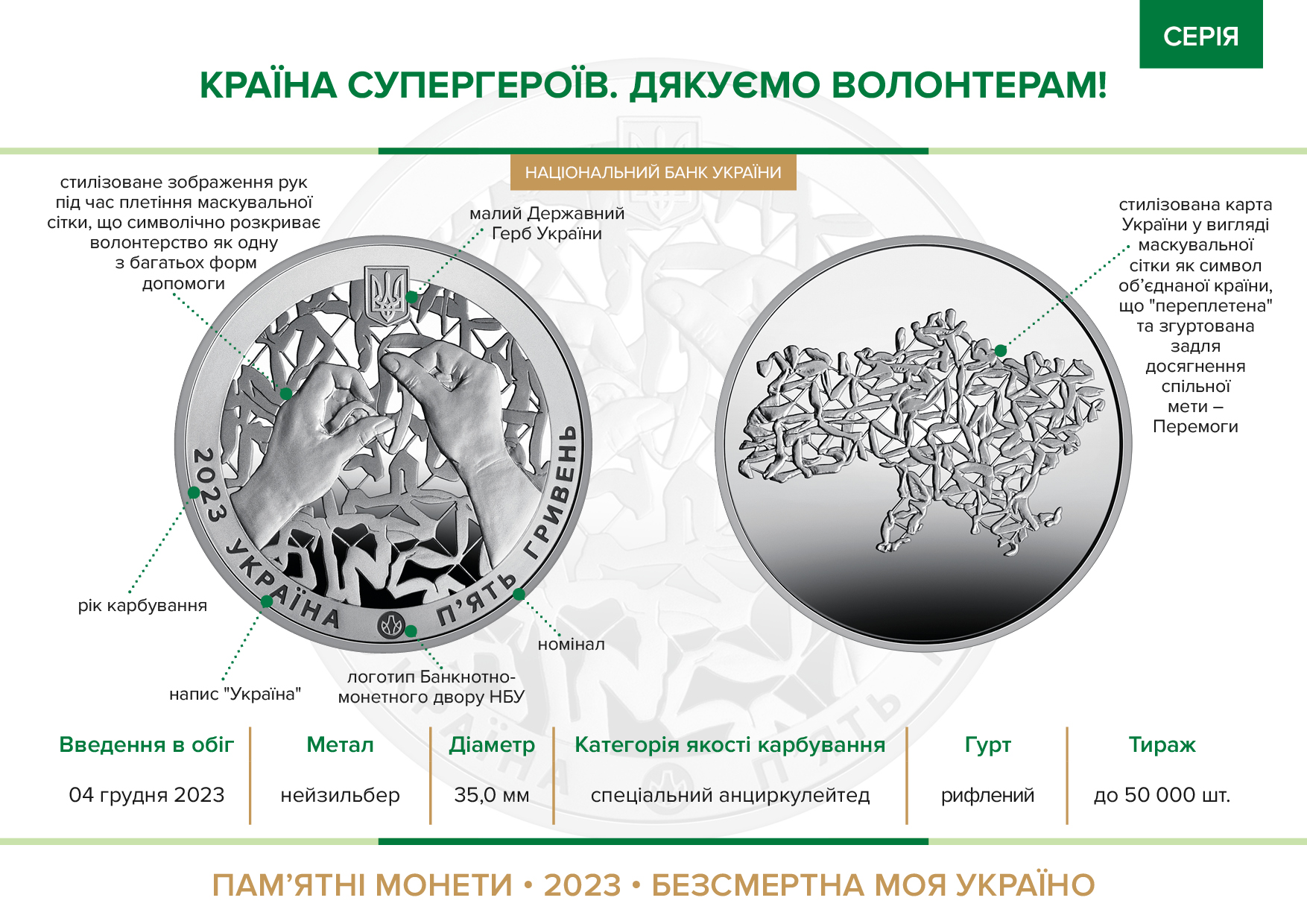 Памятная монета посвящена украинским волонтерам. Они донатят, организуют сборы средств, приобретают и доставляют технику, снаряжение, продукты, лекарства, ищут и находят пути решения самых неотложных потребностей защитников и защитниц Украины. Своей вовлеченностью, заботой, настойчивостью и просто искренней улыбкой они усиливают наше войско, помогают сопротивляться врагу. Вдохновенные сердца, не знающие усталости, настоящие супергерои – волонтеры.
