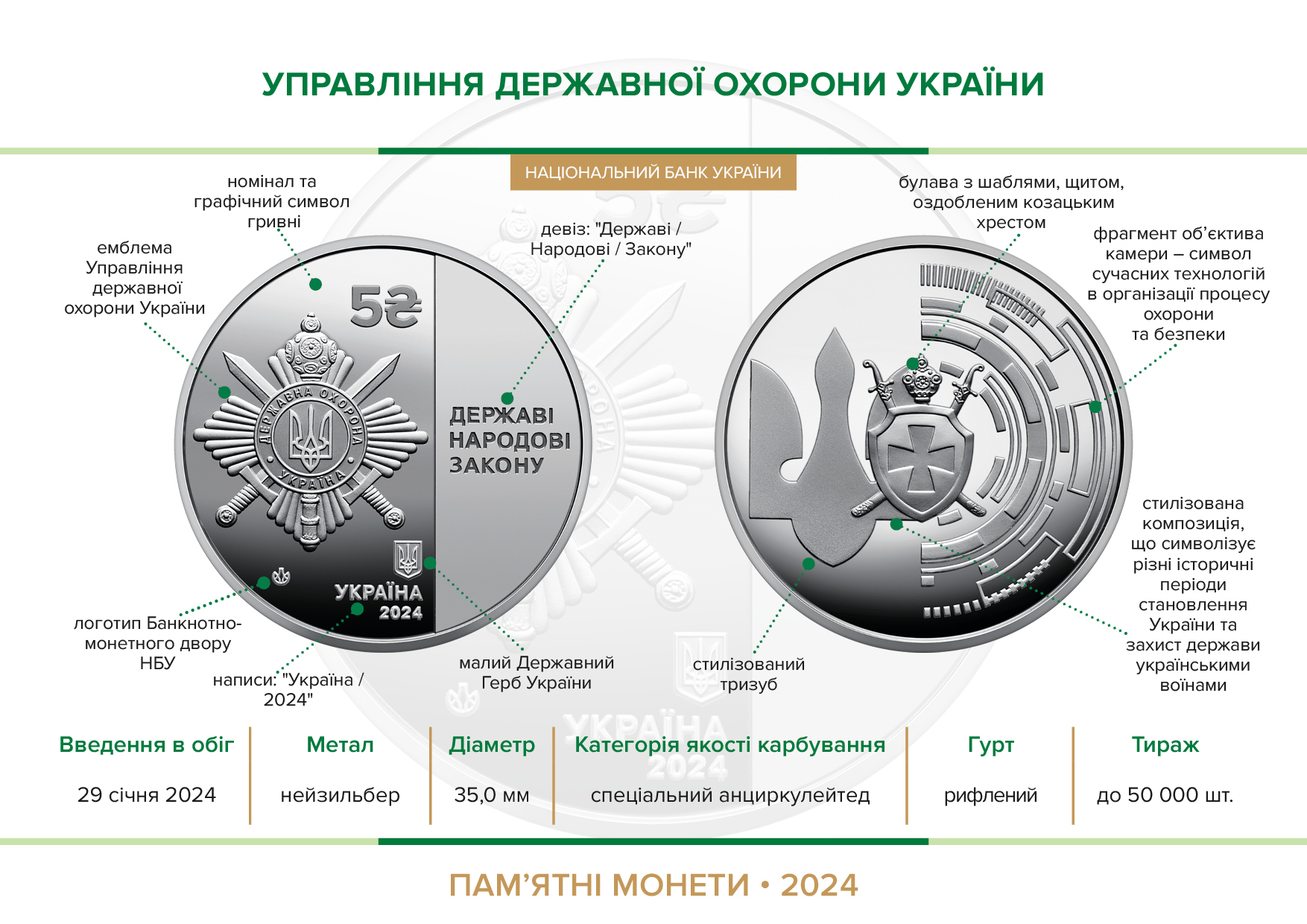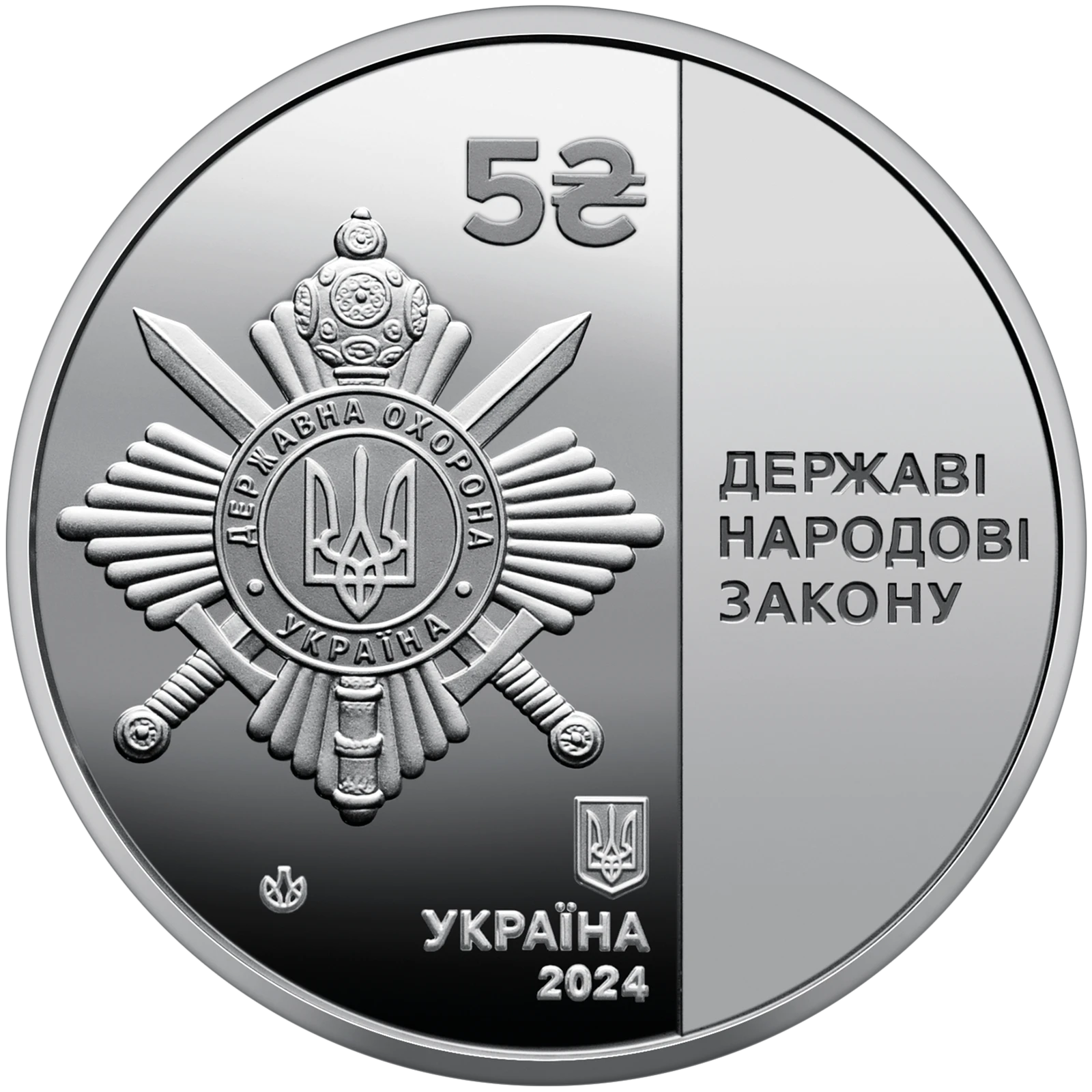 Все объявления о продаже монеты на нашем сайтеНа аверсе монеты размещены: на зеркальном фоне эмблема Управления государственной охраны Украины (слева), номинал 5 и графический символ гривны (вверху над эмблемой); малый Государственный Герб Украины, надписи: УКРАИНА/2024, логотип Банкнотно-монетного двора Национального банка Украины (внизу под эмблемой); справа на матовом фоне девиз: ГОСУДАРСТВЕННЫЕ / НАРОДОВЫЕ / ЗАКОНЫ.