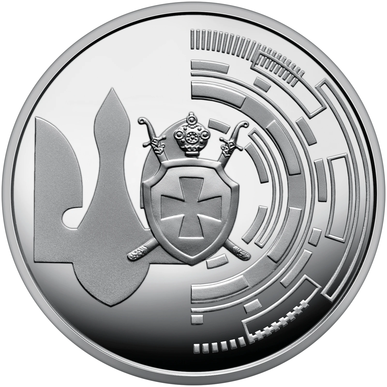 На реверсе монеты на зеркальном фоне размещена стилизованная композиция, символизирующая разные исторические периоды становления Украины и защита государства украинскими воинами, храбрость которых через поколение остается неизменной. Слева на композиции изображен стилизованный трезубец; в центре изображена булава с саблями, щитом, украшенным казацким крестом, являющимися символами власти, боевого побратимства и защиты; справа – фрагмент объектива камеры, символизирующий современные технологии в организации процесса охраны и безопасности.
