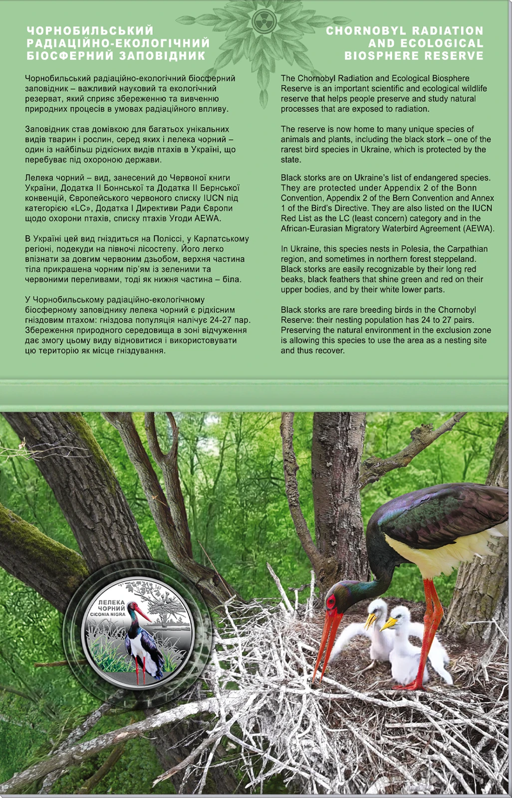Памятная монета посвящена редкой птице, которая стала одним из своеобразных символов возрождения жизни в Чернобыльской зоне – аист черном. 30-километровая зона отчуждения и зона безусловного отселения, на территории которых с 26 апреля 2016 размещен Чернобыльский радиационно-экологический биосферный заповедник, превратились в своеобразный резерват для размножения не только типичных, но и редких краснокнижных представителей животного и растительного мира, среди которых и черный. Благодаря сохранению среды в Чернобыльской зоне, популяция птицы растет. Это свидетельствует о возобновлении экосистемы региона, о том, что заповедник становится очагом биоразнообразия даже в условиях радиационного загрязнения.