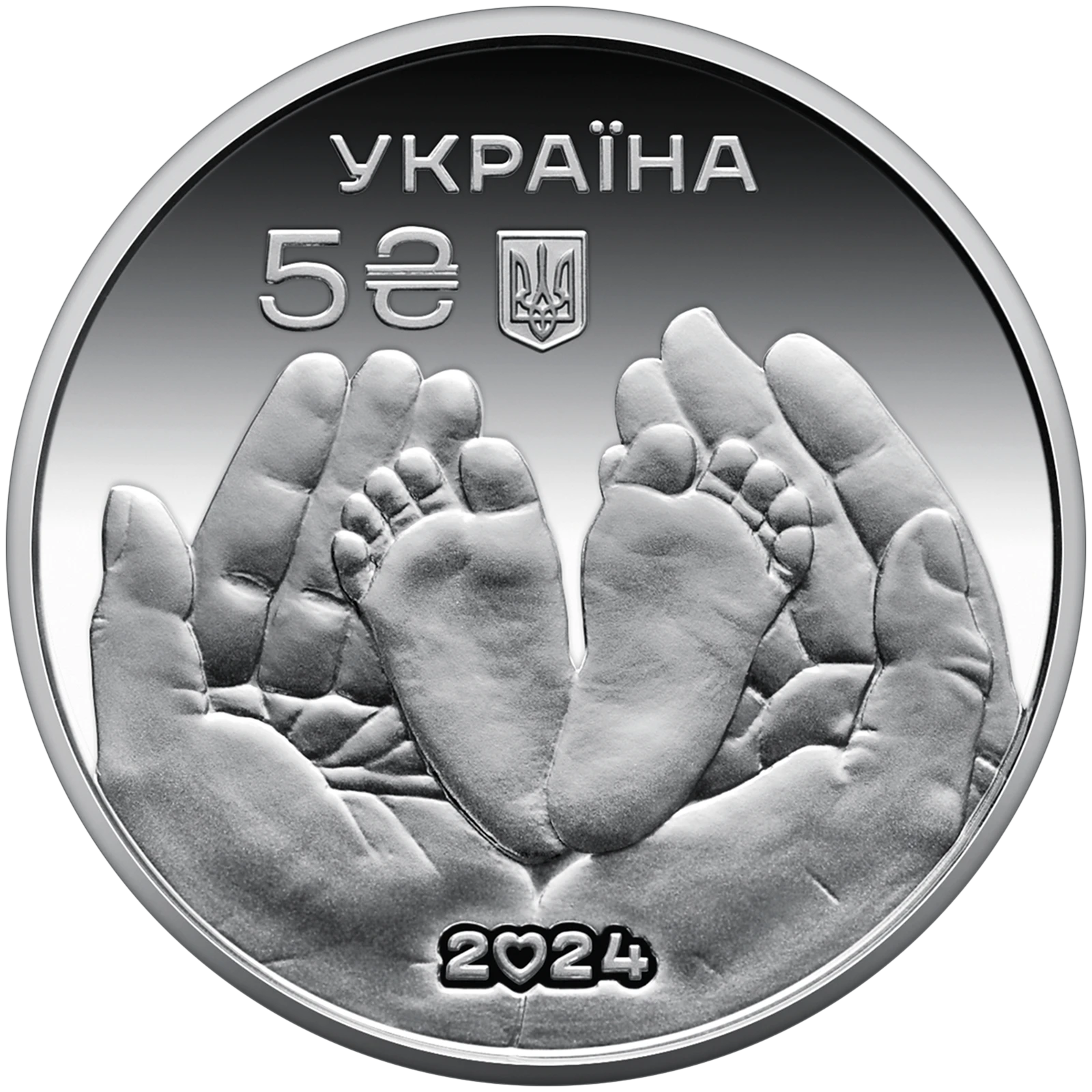 Все объявления о продаже монеты на нашем сайтеНа аверсе монеты на зеркальном фоне размещена композиция: родительские руки, ласково держащие ножки младенца, символизирующие доверие, чувство защиты и любовь, соединяющую семью (по центру); надпись УКРАИНА (вверху по центру), под которой малый Государственный Герб Украины, номинал 5 и графический символ гривны (слева от рук) и внизу по центру – год чеканки монеты 2024 (ноль изображен в форме сердца).