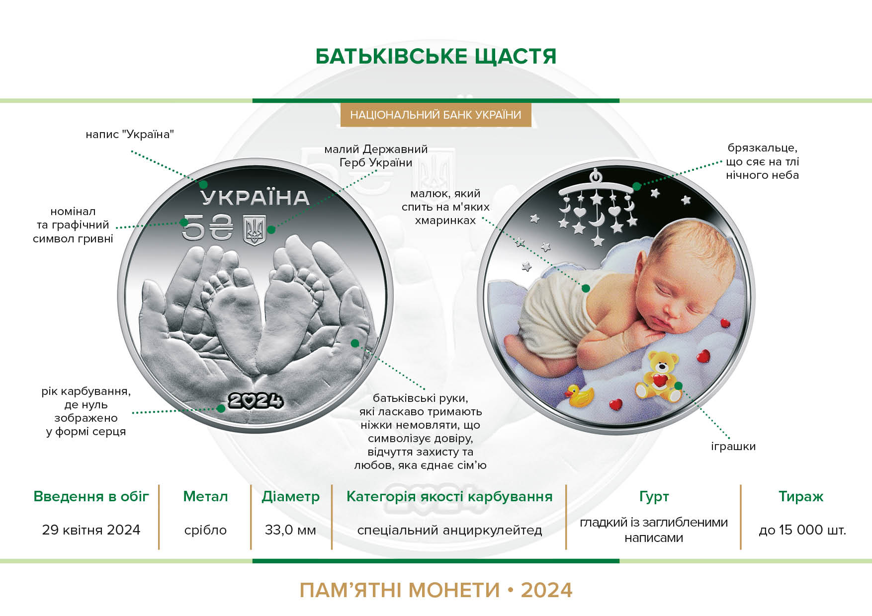 Памятная монета "Родительское счастье" посвящена самому дорогому в жизни - счастью быть родителями, трепету первых объятий и безусловной любви к малышу.