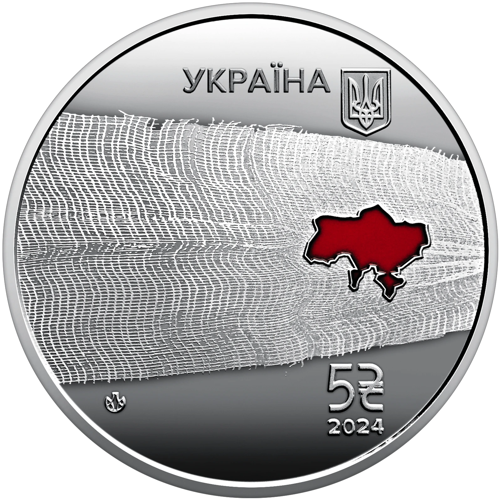 Все объявления о продаже монеты на нашем сайтеНа аверсе монеты изображена стилизованная полоска бинта, на которой проступила кровь в форме абриса территории Украины. Это незаживающая рана в сердце каждого украинца, постоянно болит и кровавит. Вверху на зеркальном фоне отчеканена надпись УКРАИНА, справа от надписи малый Государственный Герб Украины. Под бинтом внизу справа – номинал монеты 5, графический знак гривны и год чеканки монеты 2024, внизу слева – логотип Банкнотно-монетного двора Национального банка Украины.
