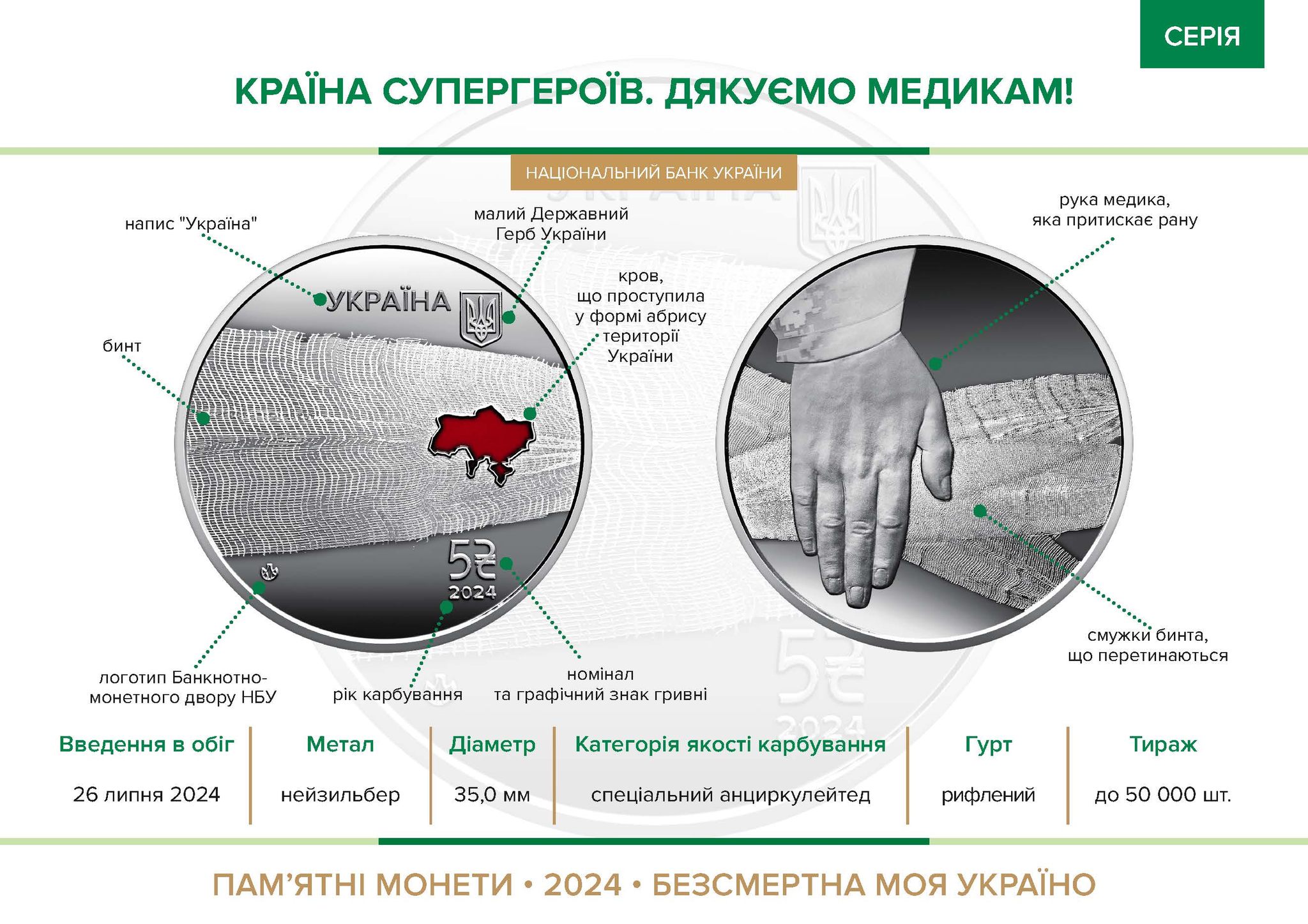 Памятная монета посвящена самоотверженному труду медицинских работников Украины, которые под вражескими обстрелами и гулом сирен воздушной тревоги спасают тысячи жизней как в тылу, так и на передовой. Эта монета является символом благодарности и уважения к тем, кто не ищет славы, но заслуживает высочайшего признания. Она отражает несгибаемый дух Украины, где каждый медик – это супергерой нашего времени!