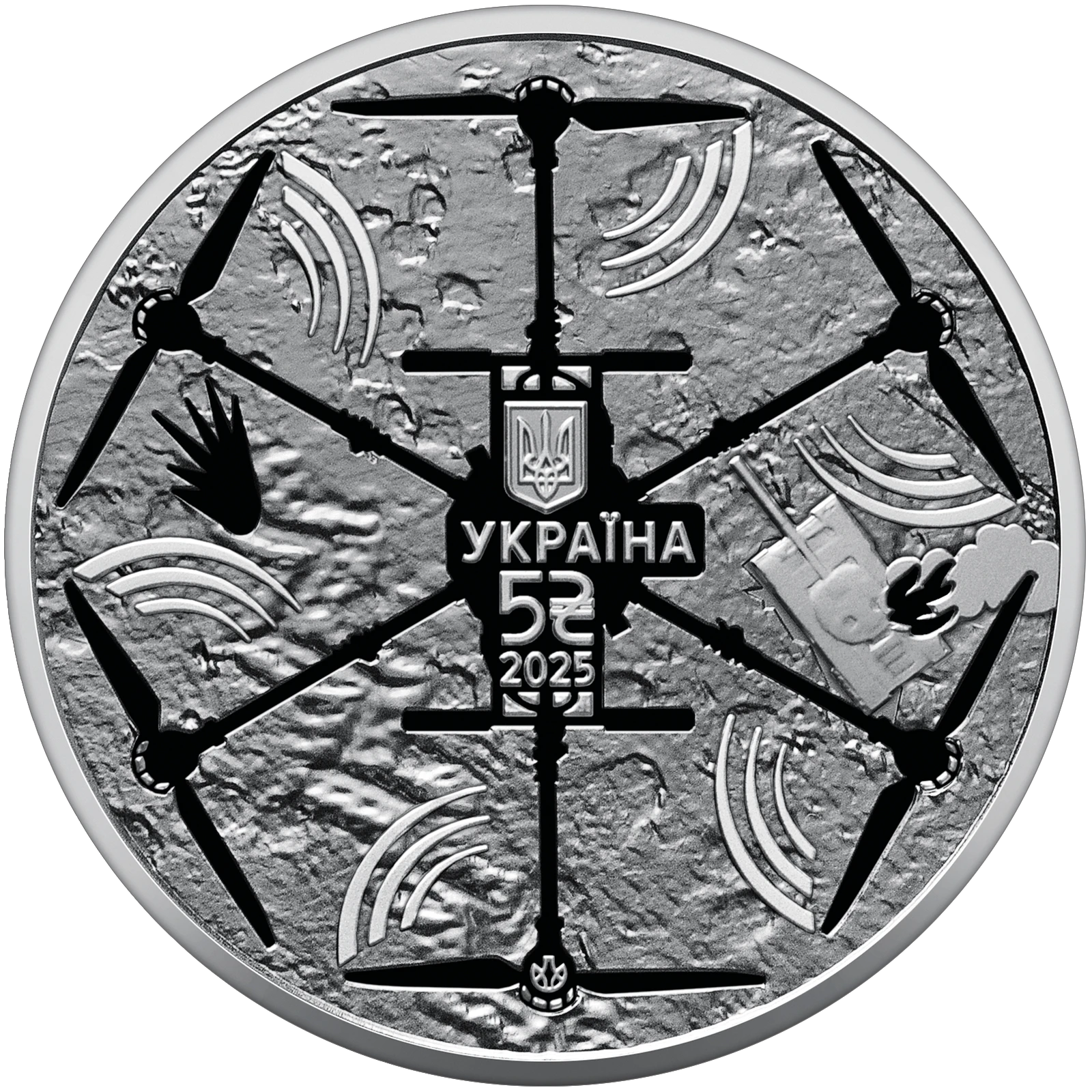 Все объявления о продаже монеты на нашем сайтеНа аверсе монеты на матовом фоне изображена искореженная поверхность Земли с характерными кратерами, которые отражают следы разрывов взрывных устройств. В левой части композиции размещены шанцы, подчеркивающие оборонительный характер сопротивления. Справа изображен подбитый вражеский танк, пылающий, символизируя успешное уничтожение вражеской техники. Над этой динамичной картиной поля боя в полете завис силуэт дрона "Vampire". В центральной части композиции размещен малый Государственный Герб Украины; ниже указаны надписи: Украина, номинал 5 и графический знак гривны, а также год чеканки монеты – 2025. Внизу по центру размещен логотип Банкнотно-монетного двора Национального банка Украины.