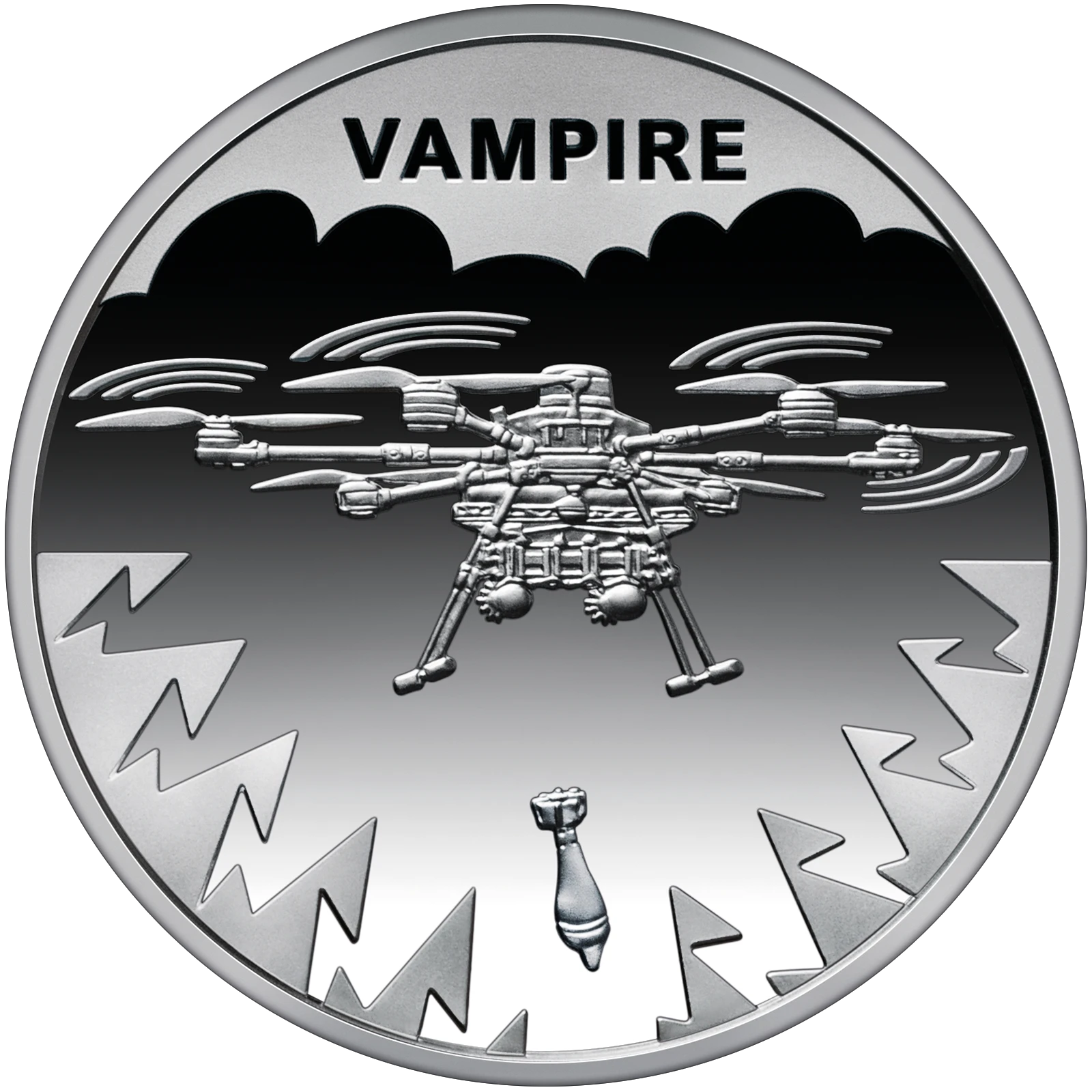 На реверсе монеты изображен гексакоптер "Vampire" в ключевой момент выполнения боевого задания – в полете во время сброса боеприпаса. Фоном для центрального элемента служит стилизованное облако, из которого вычеркиваются молнии, символизирующие мощь, скорость и неотвратимость ударов, нанесенных этим беспилотником. В верхней части монеты-надпись VAMPIRE.