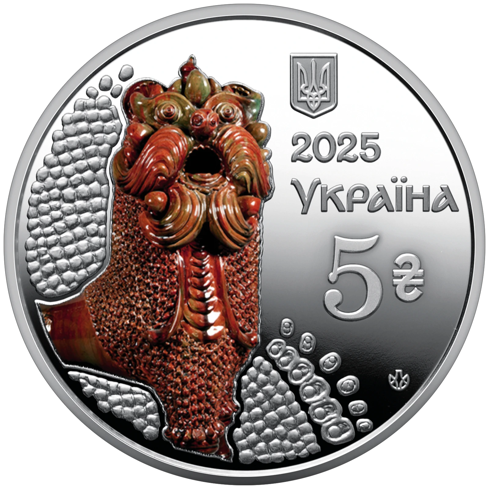 Все объявления о продаже монеты на нашем сайтеНа аверсе монеты в центре композиции изображена зооморфная скульптура " Лев " авторства Василия Емельяненко (элемент отделки – цветная печать). Вдоль скульптуры размещены фрагменты характерного налепного декора зооморфной скульптуры. Справа-малый Государственный Герб Украины, год чеканки 2025, надпись Украина, номинал 5 и графический знак гривны, а также логотип Банкнотно-монетного двора Национального банка Украины.