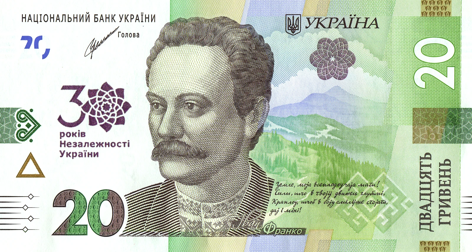 Пока что нет ни одного объявления. Выставить на продажуПамятная банкнота номиналом 20 гривен образца 2018 года с подписью председателя Национального банка Украины Кирилла Шевченко введена в обращение к 30-летию независимости Украины. Памятная банкнота содержит все элементы защиты банкноты номиналом 20 гривен образца 2018 года с дополнительным нанесением на лицевой стороне, на месте водяного знака, трафаретной печатью краской OVMI айдентики – “30 лет независимости Украины”; размер банкноты – 69 x 130 мм. Основное изображение лицевой стороны-портрет Ивана Франко. Основное изображение обратной стороны-здание Львовского оперного театра.