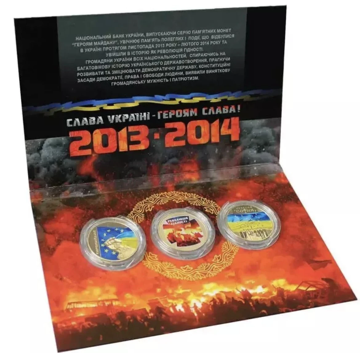 Набор памятных монет «Героям Майдана» (2015) состоит из трёх монет номиналом 5 гривен: «Евромайдан», «Революция достоинства» и «Небесная сотня». Монеты посвящены общественно-политическим событиям в Украине 2013–2014 годов и их участникам. Все монеты выполнены с использованием технологии тампопечати. Монета «Революция достоинства» посвящена гражданской активности общества и событиям, связанным с защитой демократических ценностей и прав человека. Монета «Евромайдан» отражает протестные акции, проходившие в Украине с ноября 2013 года по февраль 2014 года. Монета «Небесная сотня» посвящена памяти погибших участников протестных событий этого периода.