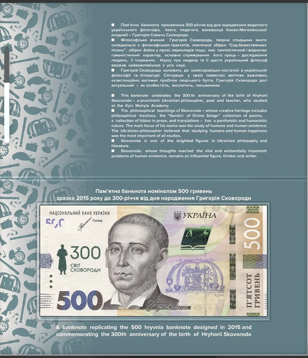Новинка!!! Дуже красива Пам’ятна банкнота до 300-річчя від Дня народження Григорія Сковороди (у сувенірній упаковці), номінал 500 грн.Продається в сувенірній упаковці що є паспортом Банкноти, де вказано всі характеристики!