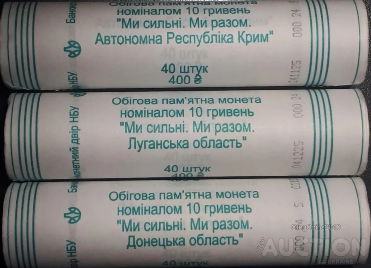 Три роли обігових монет номiналом 10 грн., 2025 р.в. "Ми сильні. Ми разом. Автономна республіка Крим, + Донецька область , + Луганська область". В ролах по 40 монет, аверс - реверс. Одна монета 20 грн.Пересилка Укрпоштою, Новою поштою за рахунок покупця. Сплата на банкiвську платiжну картку або за особистою зустрiччю в Харковнi. Свiтлини ролiв надам.