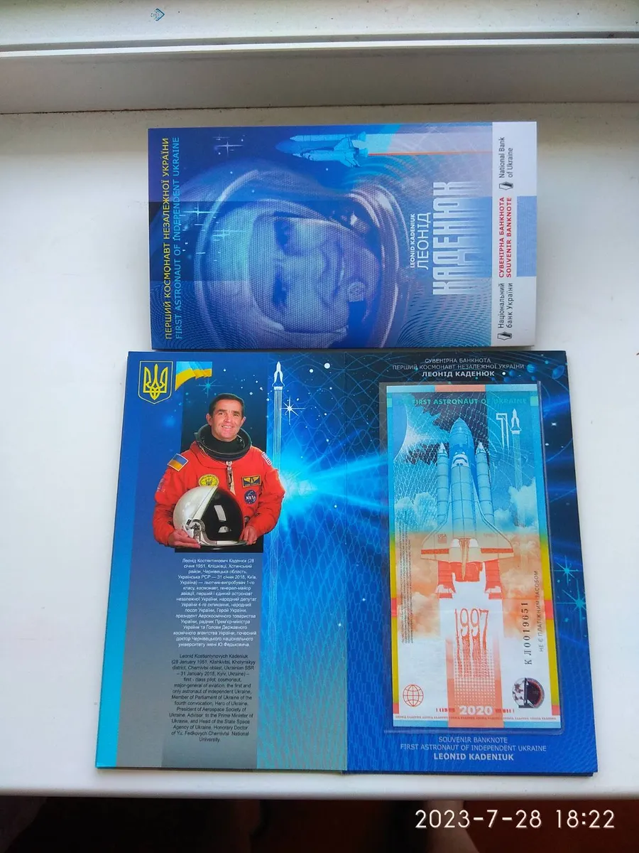 Україна. 2020р. Сувенірна банкнота "Перший космонавт незалежної України ЛЕОНІД КАДЕНЮК". -(у сувенірному пакованні)- (Дивіться опис).