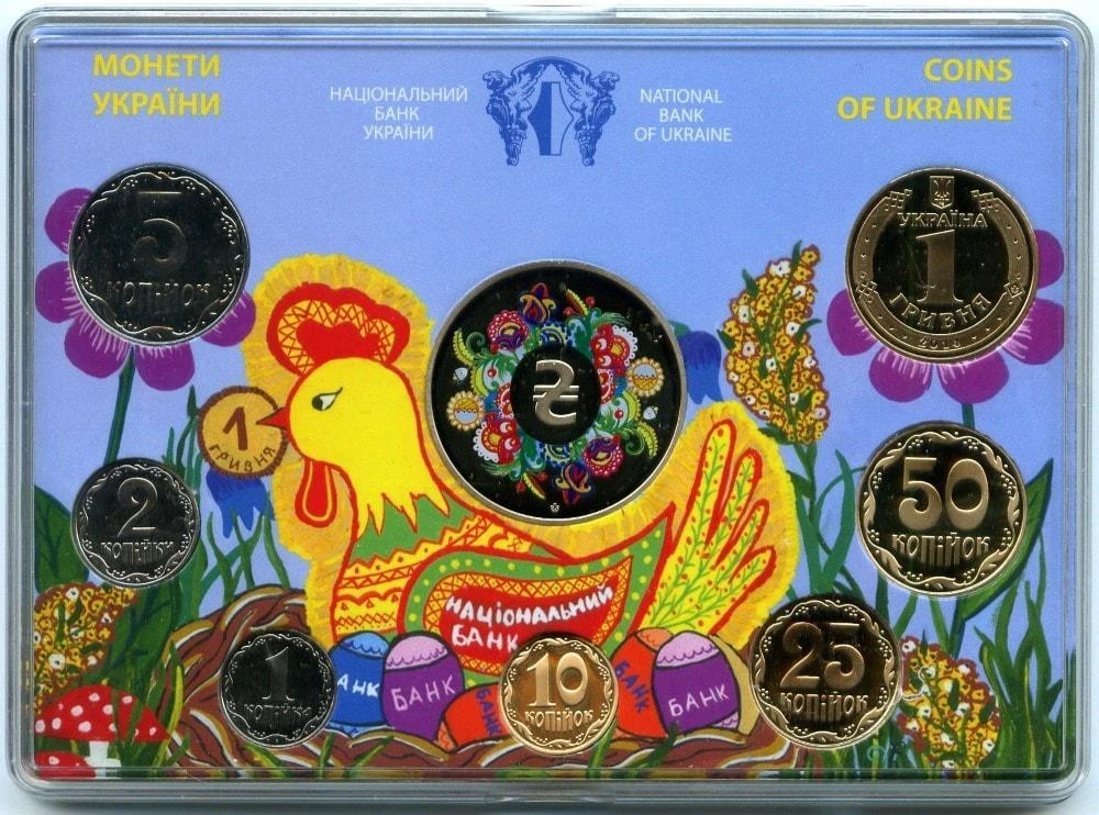 У набір увійшли випущені в покращеній якості розмінні монети усіх номіналів: 1, 2, 5 копійок (нержавіюча сталь), 10, 25, 50 копійок, повсякденна монета номіналом 1 гривня (алюмінієва бронза), а також випущений пам'ятний жетон «15 років Монетному двору НБУ»