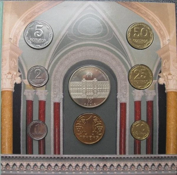 В набір увійшли випущені в покращеній якості розмінні монети усіх номіналів: 1, 2, 5 копійок (акмонітал; згідно характеристики НБУ – нержавіюча сталь), 10, 25, 50 копійок, обігова монета номіналом 1 гривня (алюмінієва бронза), а також випущена з нейзильберу пам'ятна монета номіналом 5 гривень «10-річчя Національного банку України».